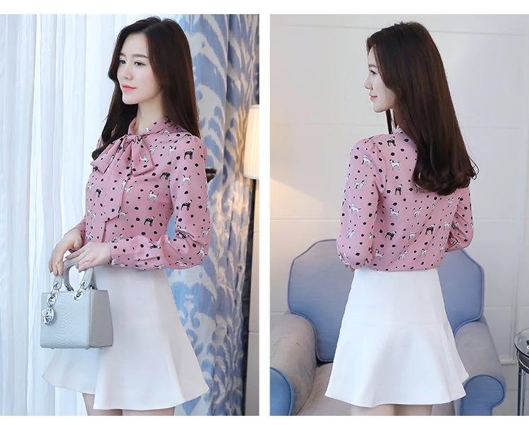 Милая женская блузка с принтом собаки, шифоновая кружевная рубашка с воротником и бантом, топ с длинными рукавами, S-XXL, белый, розовый цвет, blusas feminina, T84092