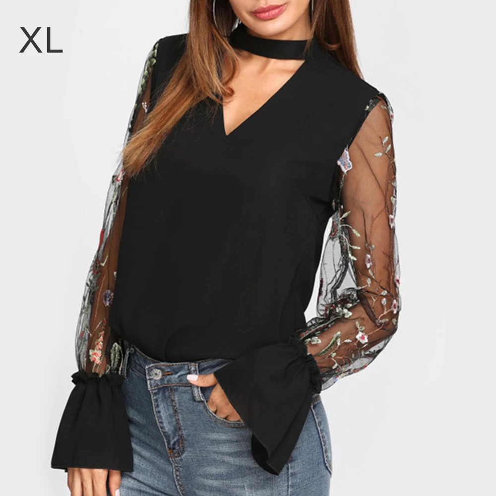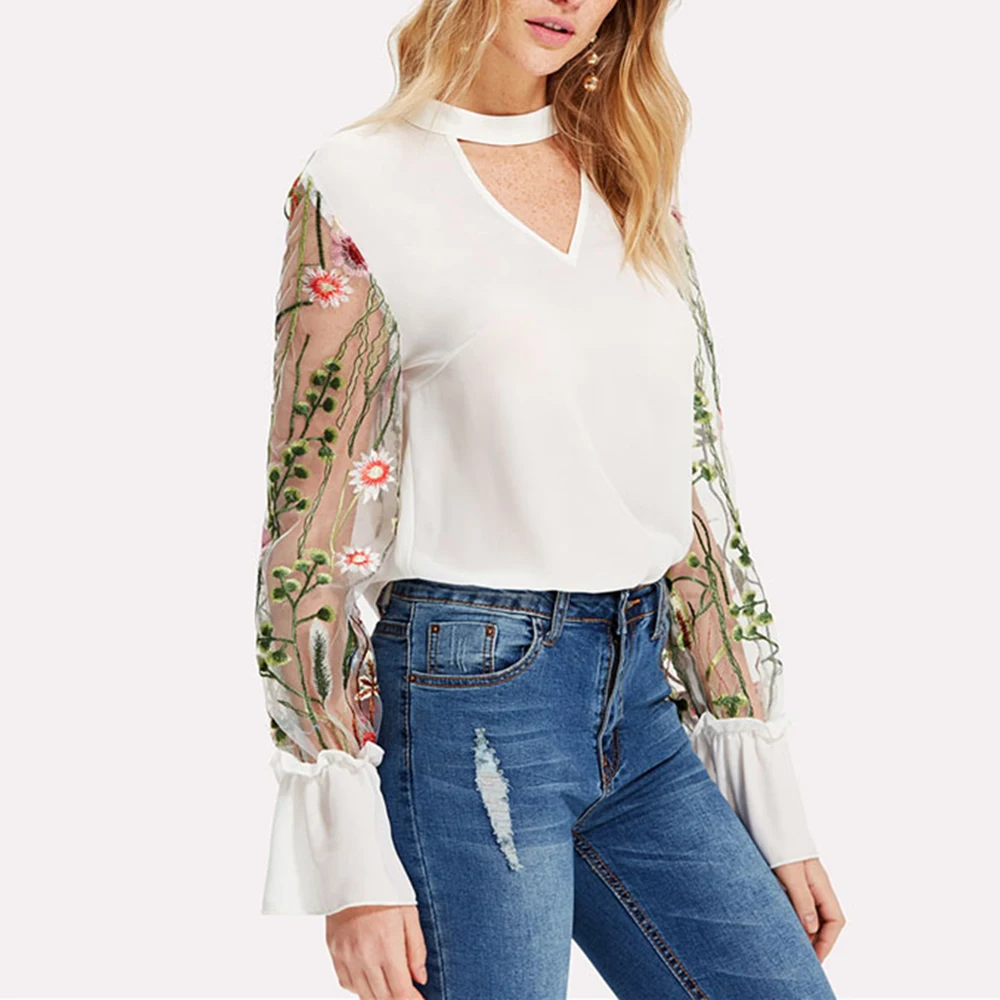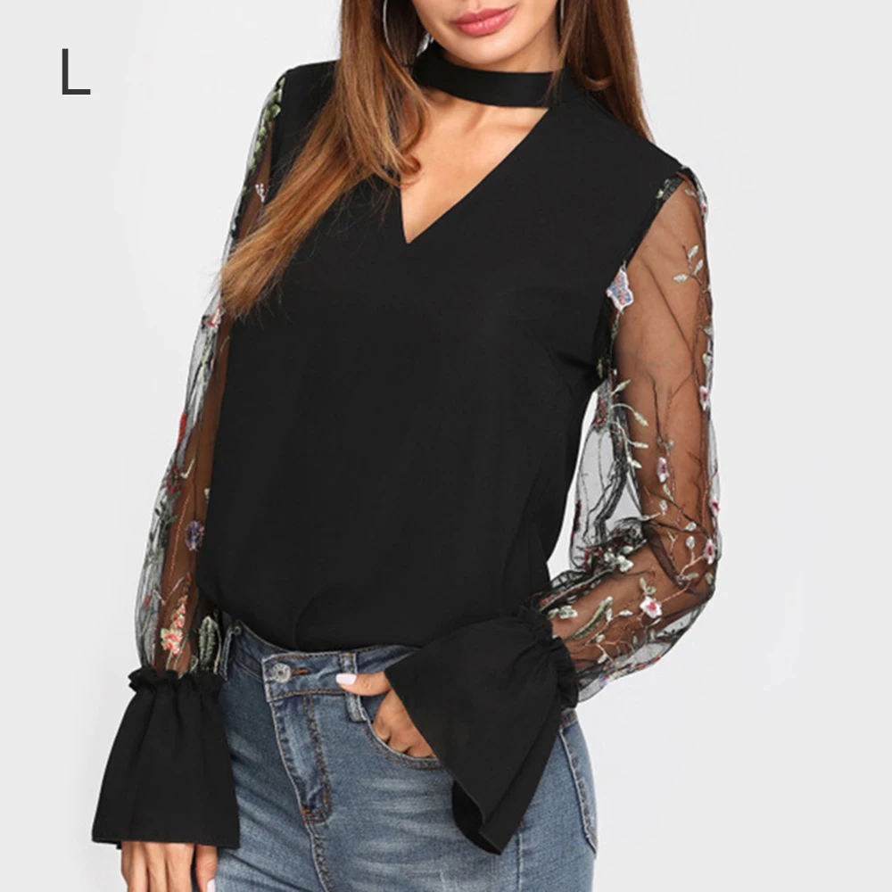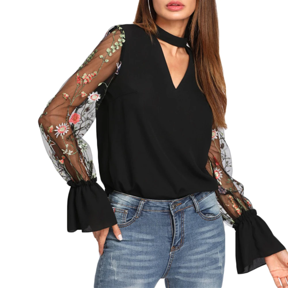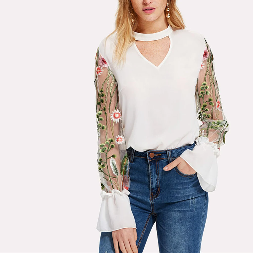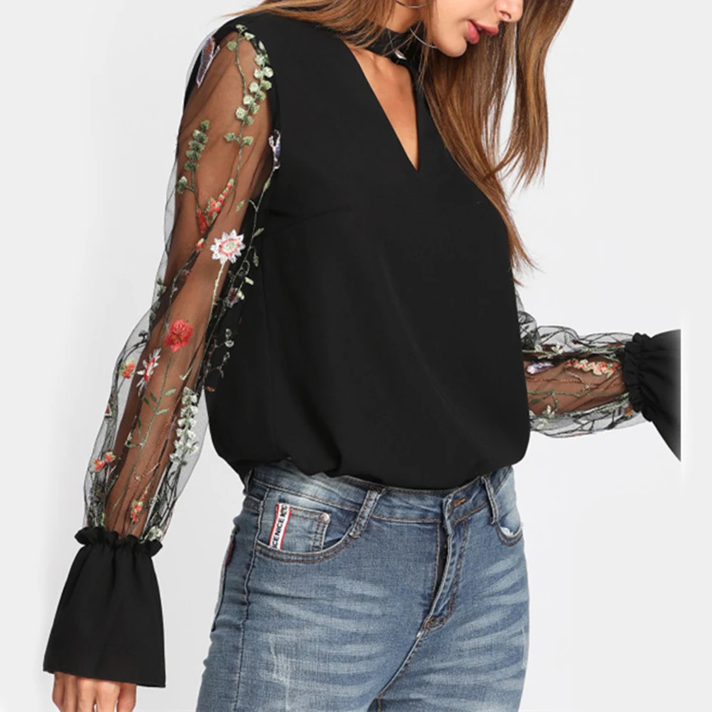 Шифоновая Блузка с прозрачным соединением, с v-образным вырезом, цветочной вышивкой, топы с длинным Расклешенным рукавом, рубашка 2018 OL Style с v-образным вырезом