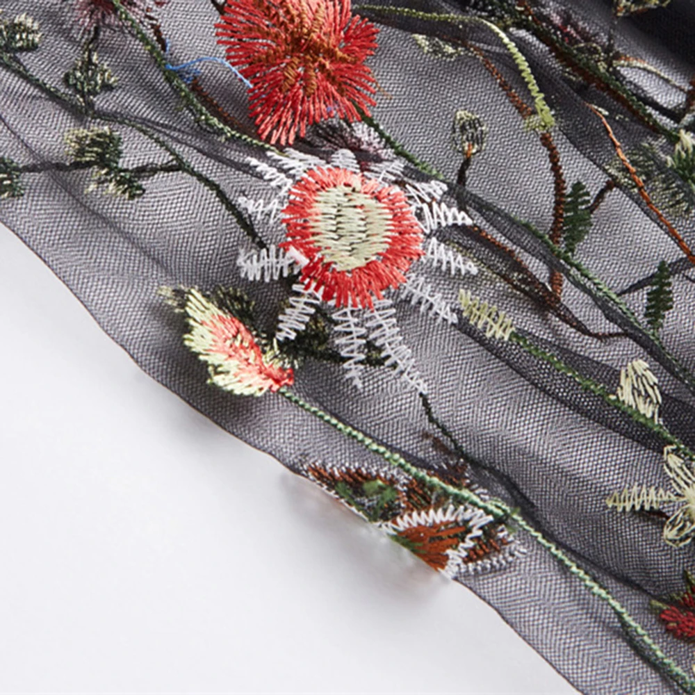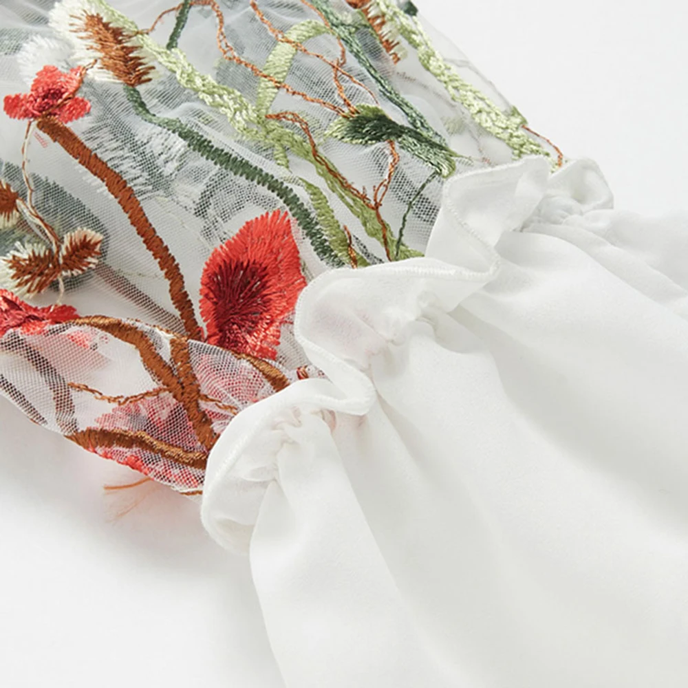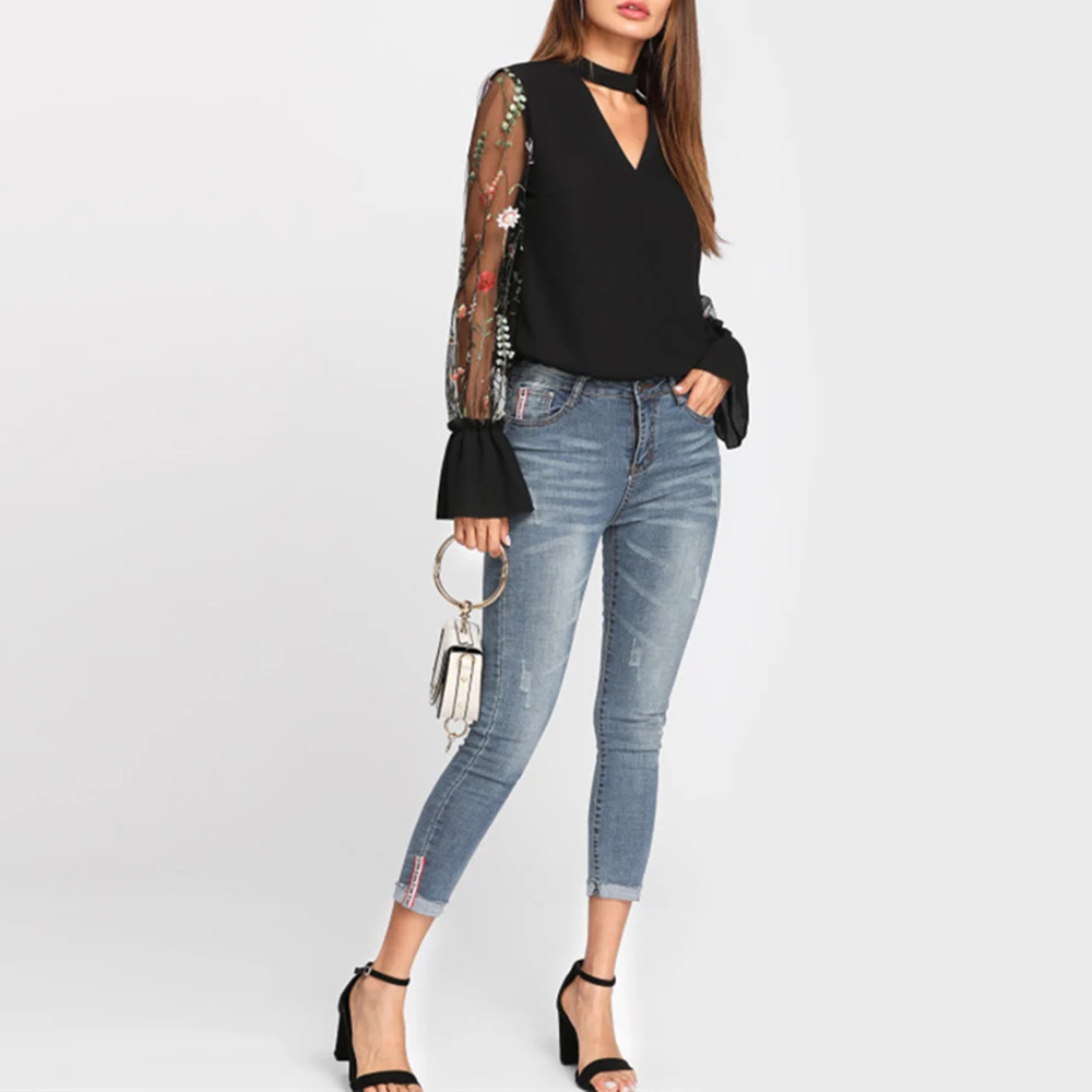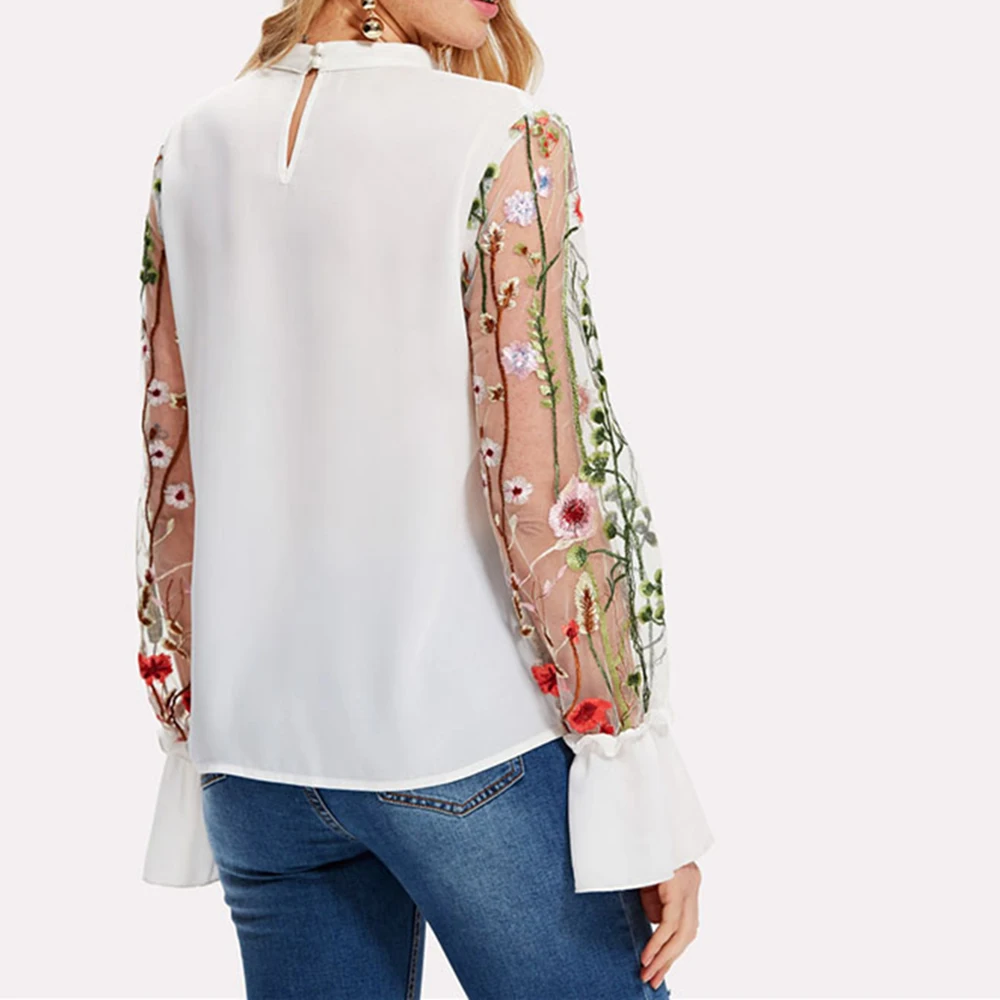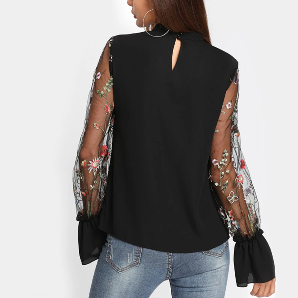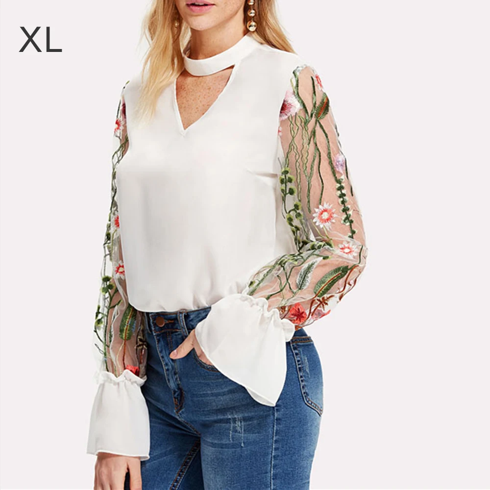 Шифоновая Блузка с прозрачным соединением, с v-образным вырезом, цветочной вышивкой, топы с длинным Расклешенным рукавом, рубашка 2018 OL Style с v-образным вырезом