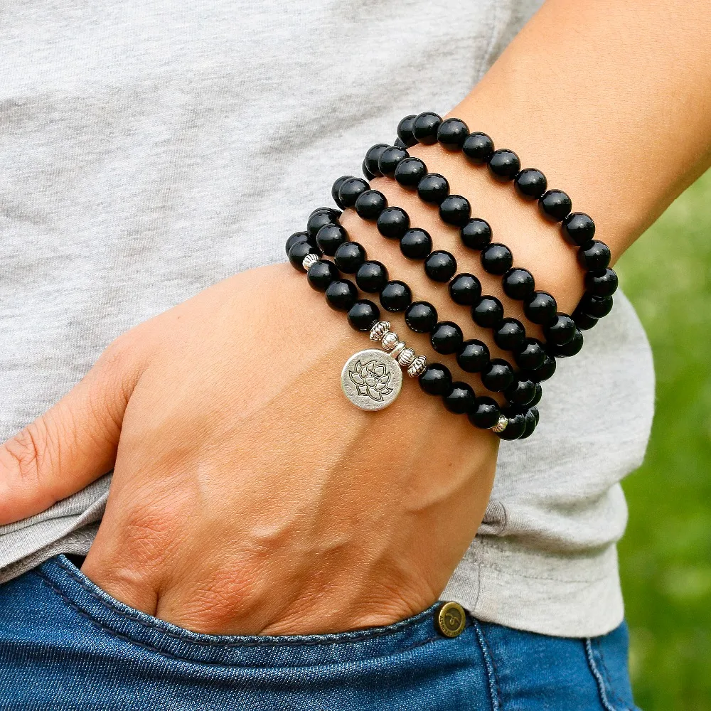 Браслет из 108 бусин, натуральный черный оникс, подвеска-ом