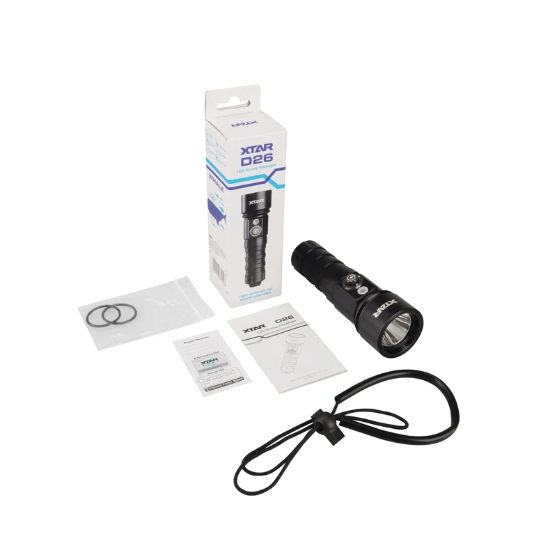 Как профессиональный фонарик для дайвинга, XTAR D26 использует новейший Премиум CREE XM-L2 U3 LED с макс. 1100lm. Отличная функция герметизации достигает 100 метров глубины погружения. Вы можете выбрать режимы, включая Режим High-Turbo-Mid-Low. Индикация мощности будет возражать, если заряда батареи достаточно. Когда емкость аккумуляторов выше 25%, светодиодный индикатор горит зеленым цветом; Емкость батареи падает на 5%-25%, светодиодный индикатор горит красным цветом; Емкость батареи опускается ниже 5%, светодиодный индикатор мигает красным цветом. С аккумулятором большой емкости 18650 или 26650 D26 позволяет вам долгое время погружения.