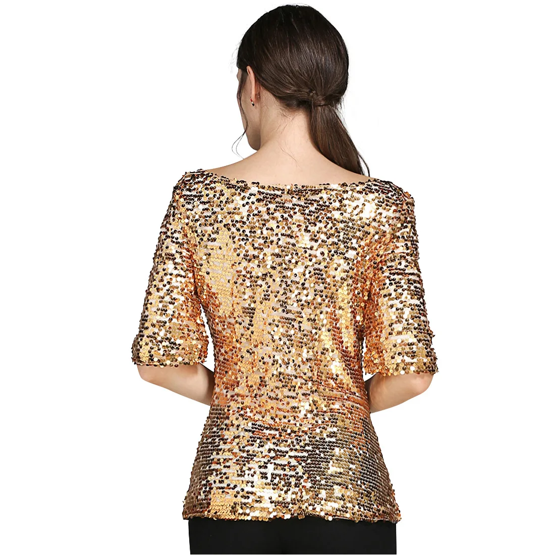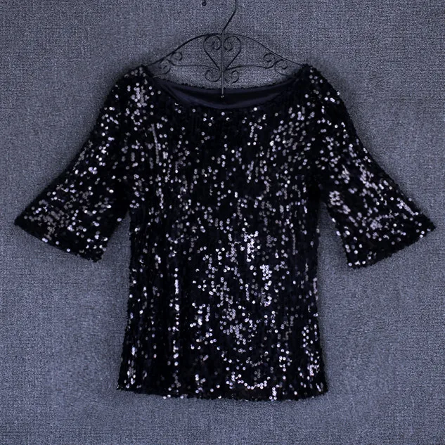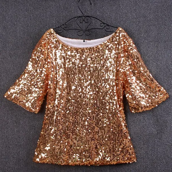 Женская Повседневная Блузка с круглым вырезом, золотистая, черная, серебристая блузка с блестками в Корейском стиле, топы для лета и осени, женская одежда, S-5XL