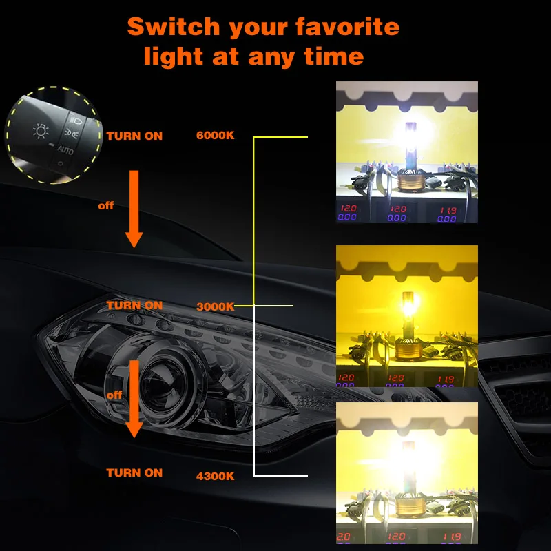 Когда вы запускаете автомобили, главный светильник будет 6000k; Если Вы выключите светильник и включите снова, светильник станет 3000k; Повторите это действие, светильник станет 4300K;