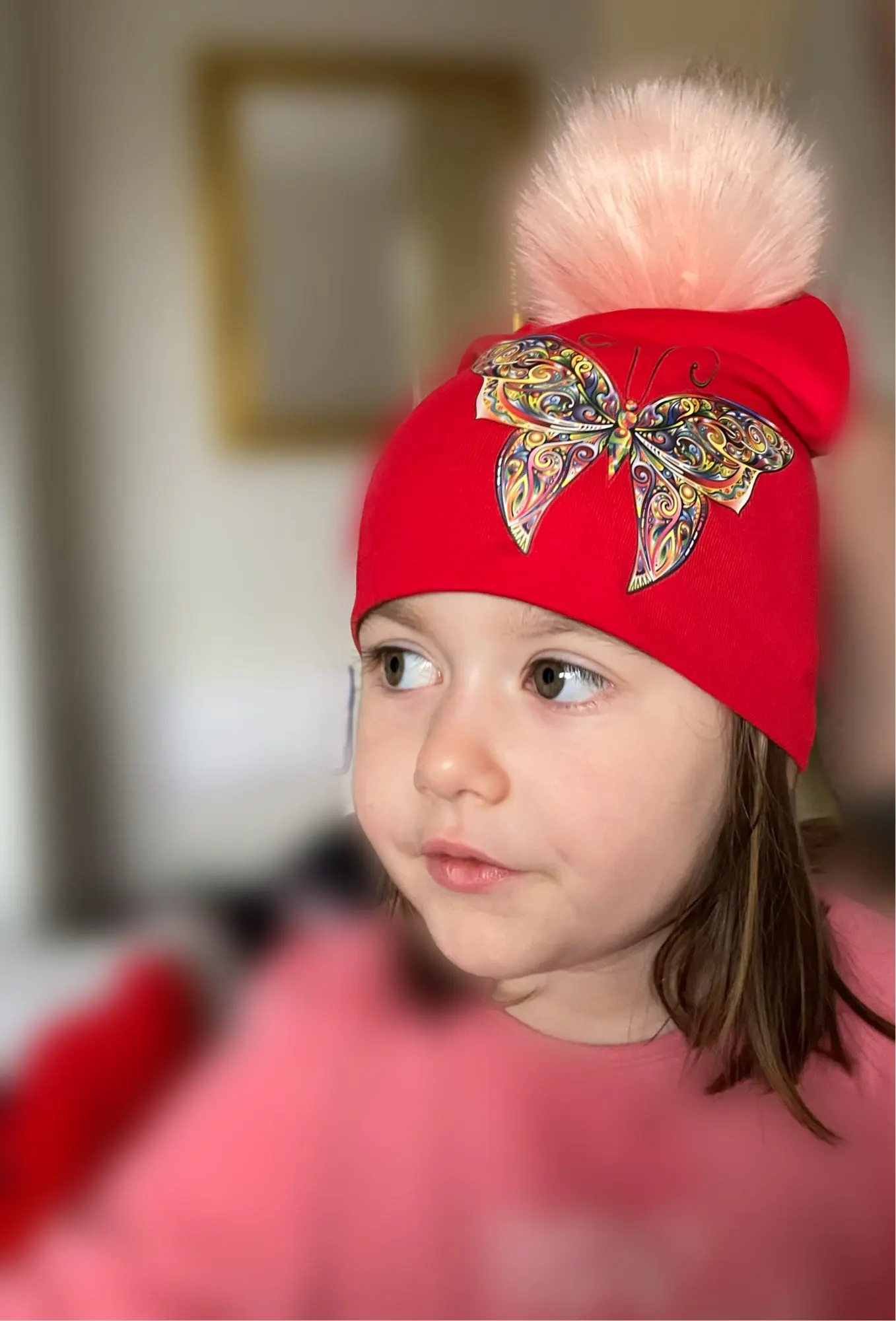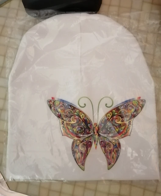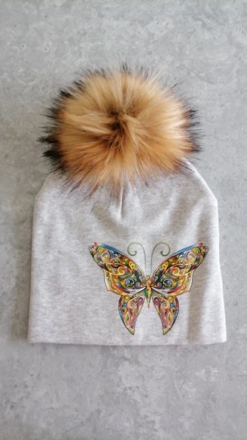беленькая шапка осенне -весений вариант ,с картинкой совпадает ,наклеенный принт с бабочкой держится вроде не плохо ,очень длинная как на годовалого ребенка , подойдёт и для более старших детей