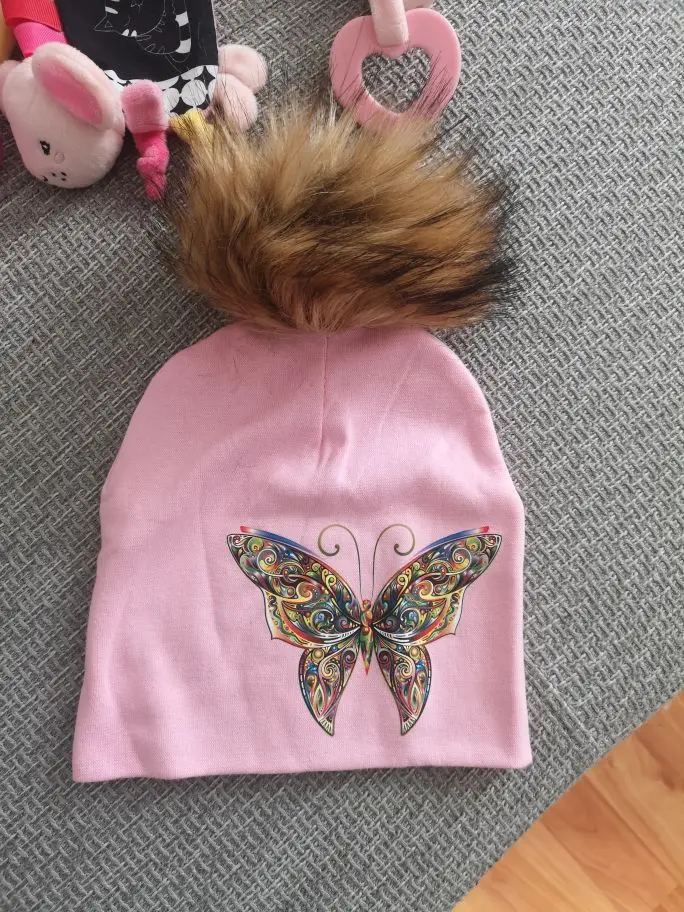 Бабочка больше чем на фото продавца. Шапочка красивая, но бабочка наклейка, боюсь что лопнет. Мех с одной стороны вылезает кусками (мех искусственный). Также он имеет специфический запах