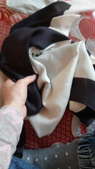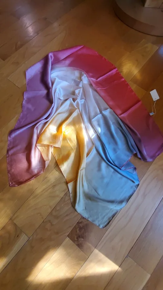 Красиво! Он не достаточно большой, чтобы носить как шаль, но определенно больше, чем носовой платок. Материал выглядит потрясающе, как шелк, несмотря на то, что полиэстер. Доставка в Канаду всего 10 дней! За цену, 250% доволен.