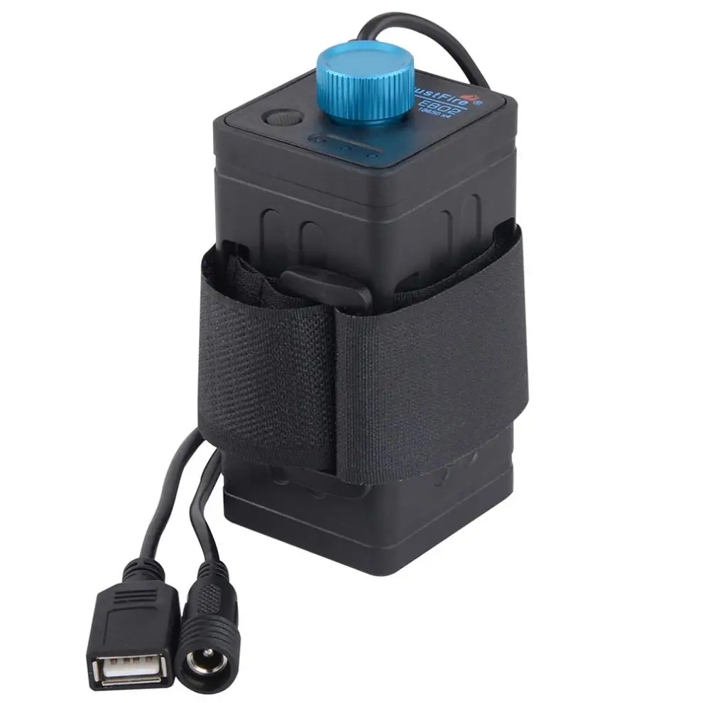 Особенности:-Может быть упакован в 4 аккумулятора 18650 и соединен с велосипедными огнями.-Двойной выход порта, круговой порт с водонепроницаемым интерфейсом резьбы, общий источник питания и зарядка, выходной ток USB интерфейса.-Уровень 3 инструкции по питанию, профессиональный водонепроницаемый.-Более 70% мощности зеленый светильник, электричество в 30%-70% Яркий желтый светильник, 30% ниже красный светильник.-Со специальными ремешками, легко носить с собой.