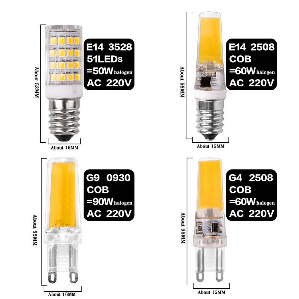 Светодиодная лампочка G4, G9, E14, затемняющее освещение, 12 В постоянного тока, 220 В переменного тока, 3 Вт, 6 Вт, 9 Вт, сменные Галогенные лампочки COB SMD, прожекторные лампочки, люстра