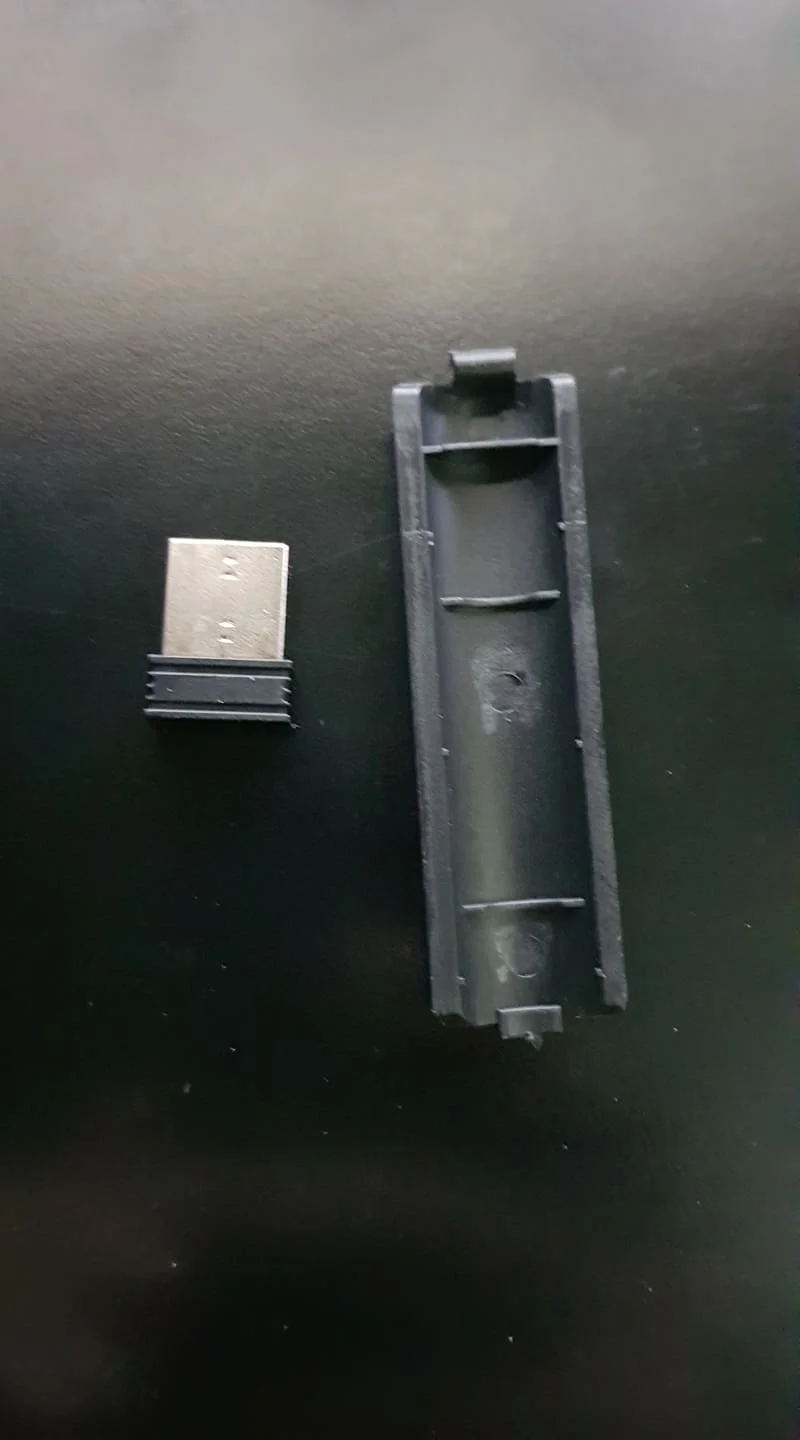 Коробка мятая. Внутри все целое, не царапанное. Место под батарейку ААА. юсб донгл внутри болтается если потрясти. Что создает ощущение дешевизны. В остальном все хорошо.