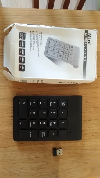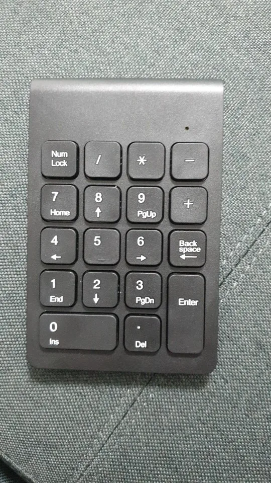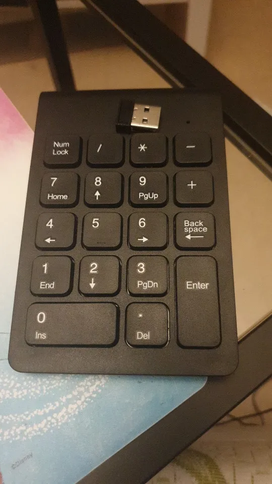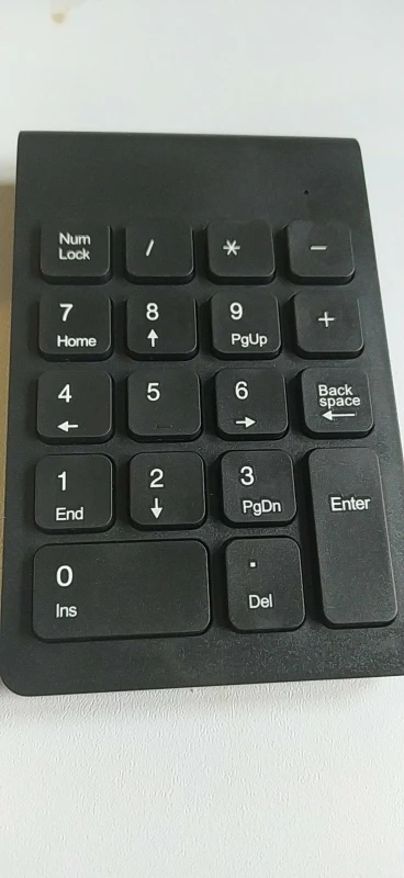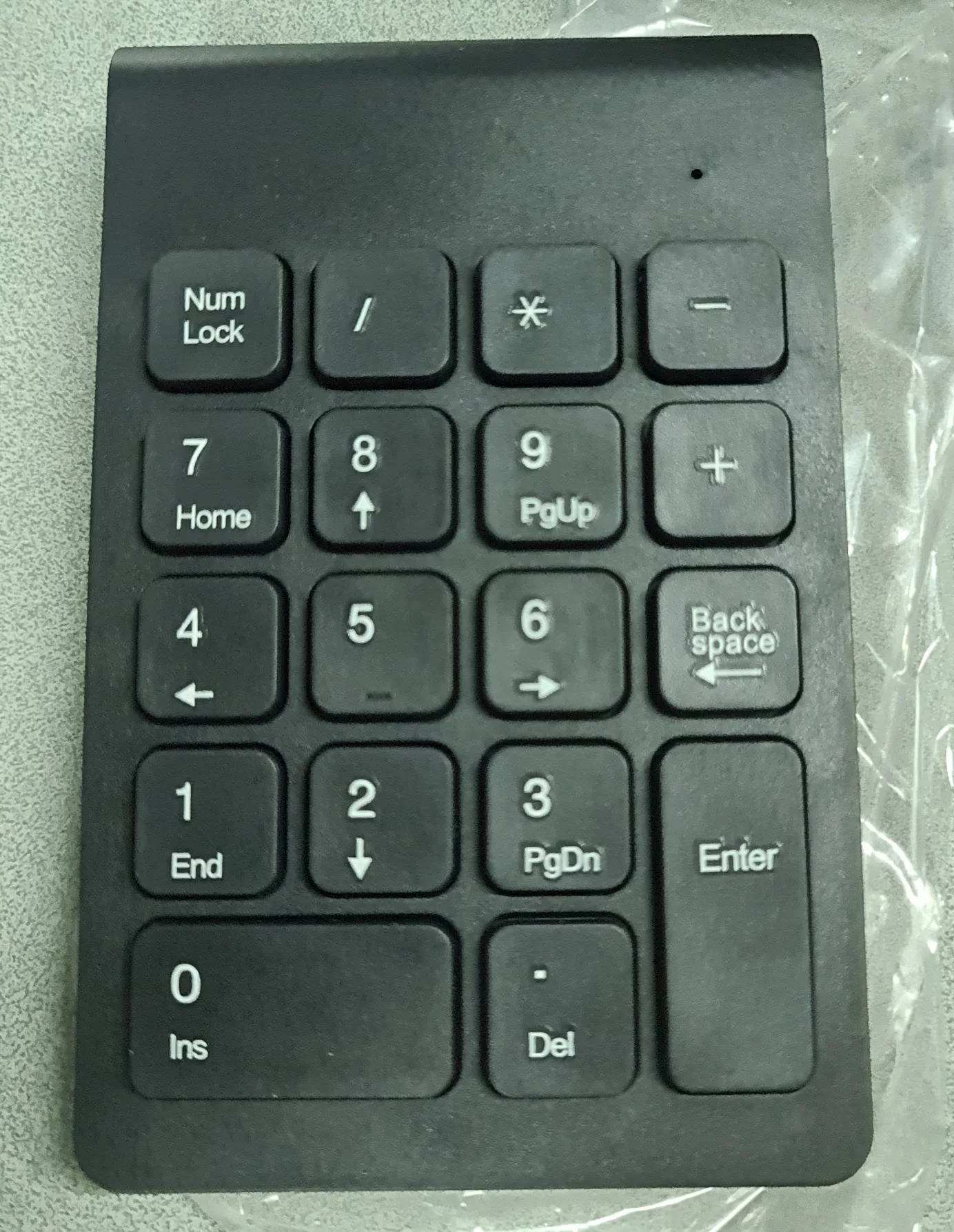 Клавиатура работает. Два режима цифры и навигация. Батарейка ААА в комплект не входит. Передатчик прячется в отсеке батарейки, не потеряется.