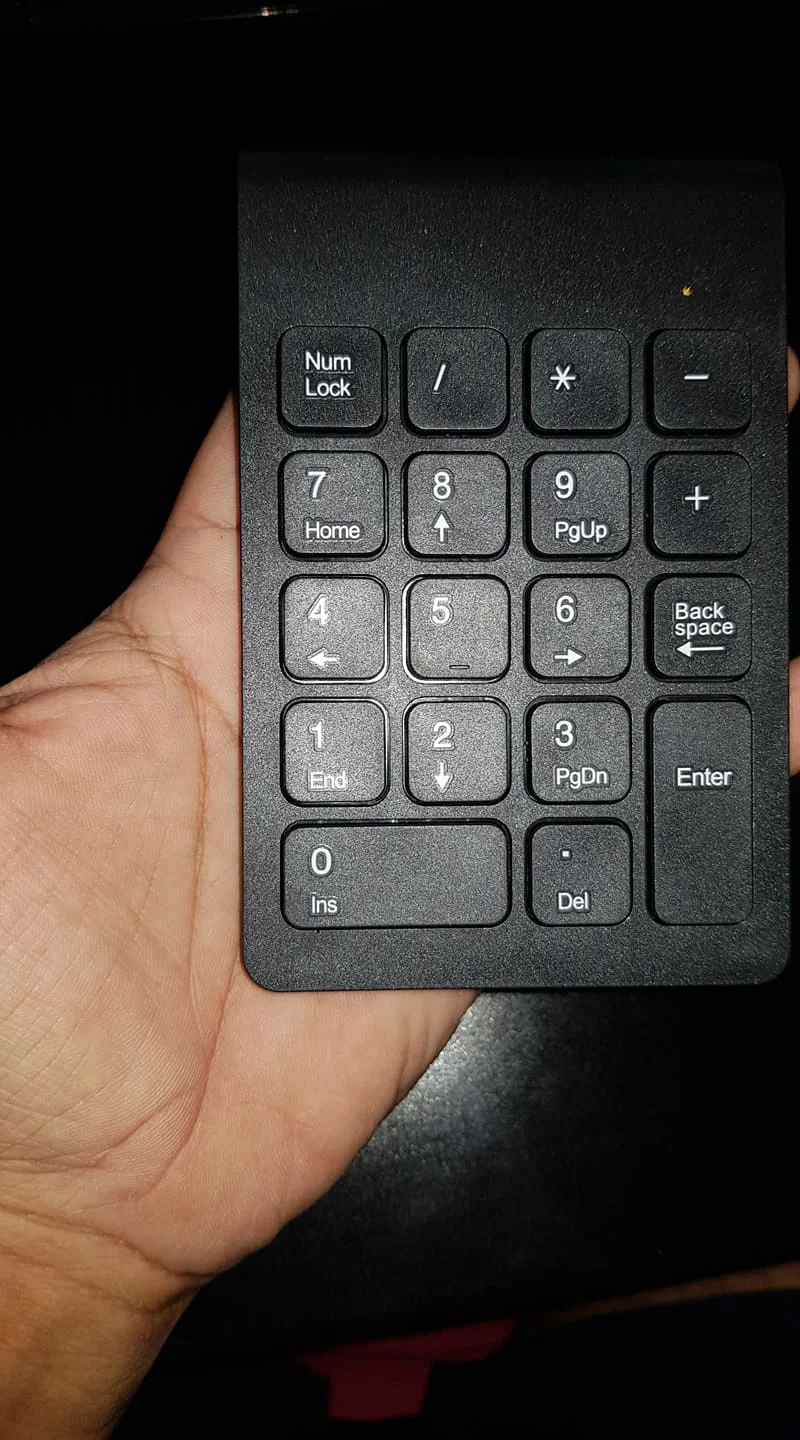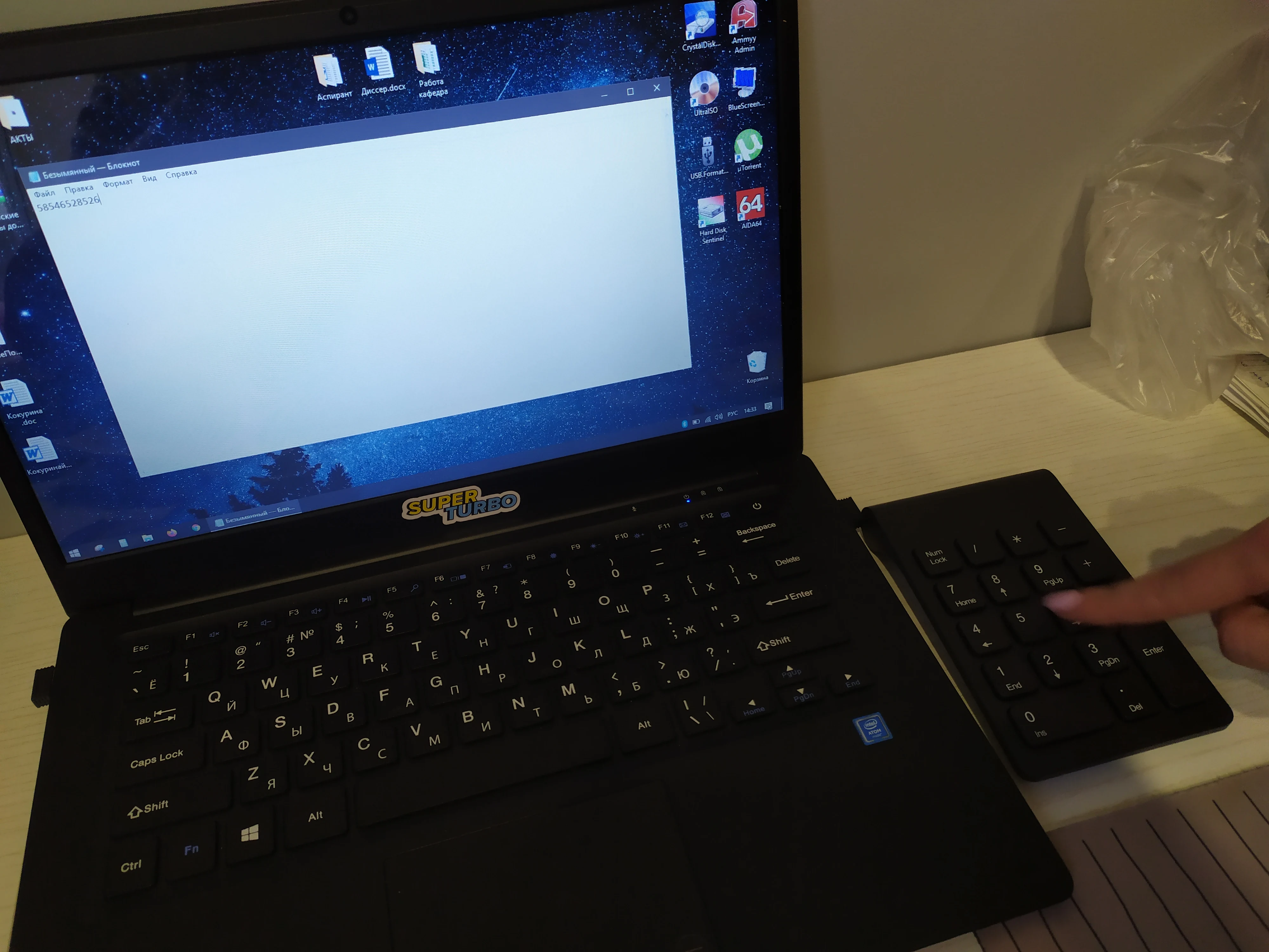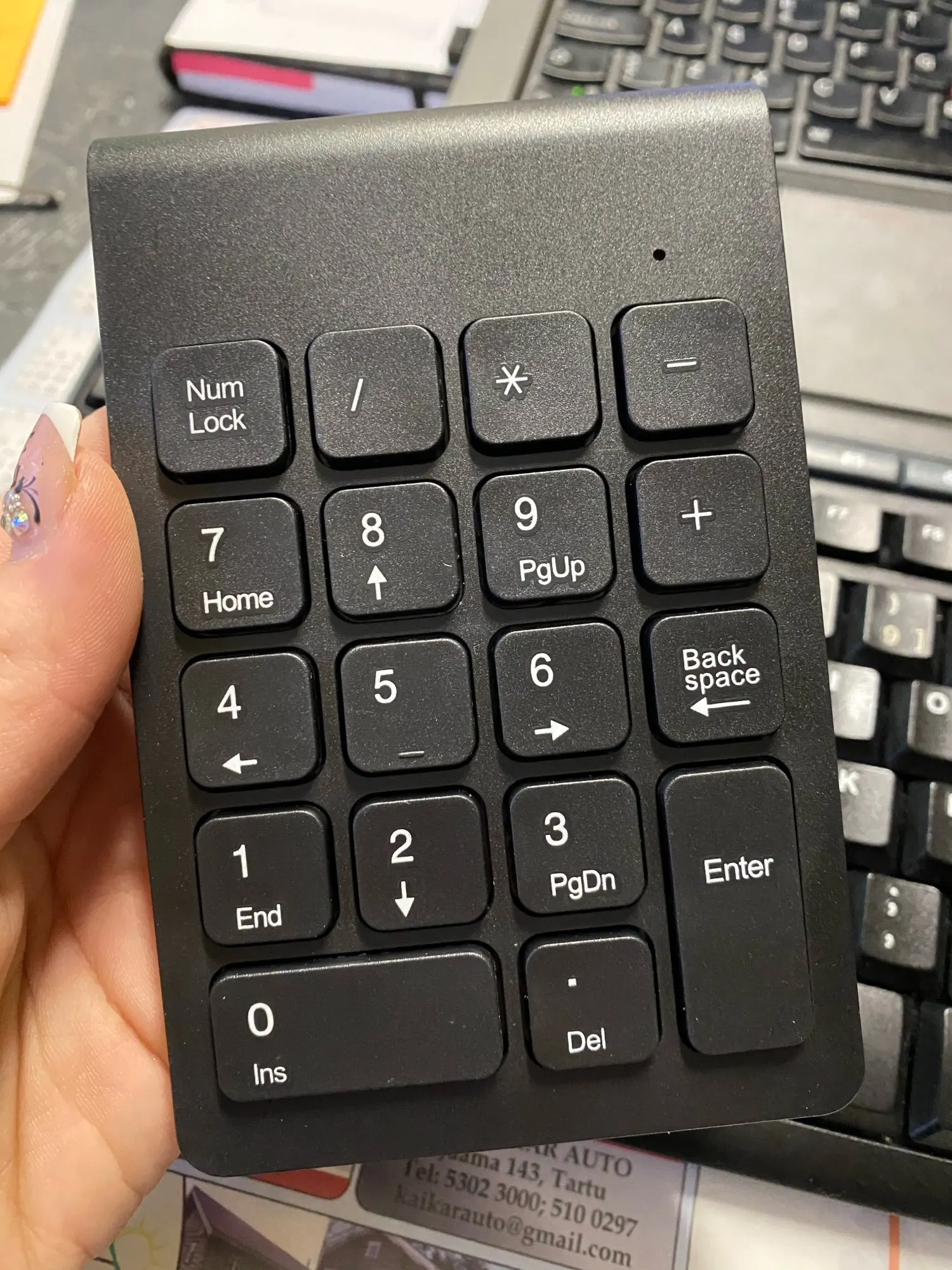 Клавиатура работает. Два режима цифры и навигация. Батарейка ААА в комплект не входит. Передатчик прячется в отсеке батарейки, не потеряется.