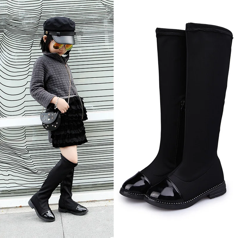 Осенние сапоги до колена для девочек, модная зимняя обувь, Повседневные детские сапоги выше колена, черная детская обувь из ПУ и ткани, сапоги для девочек