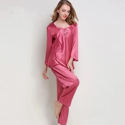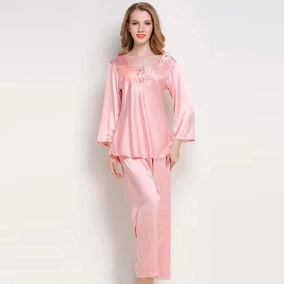 Женский пижамный комплект, Мягкая атласная пижама с v-образным вырезом и длинным рукавом, с кружевной отделкой, весна-осень