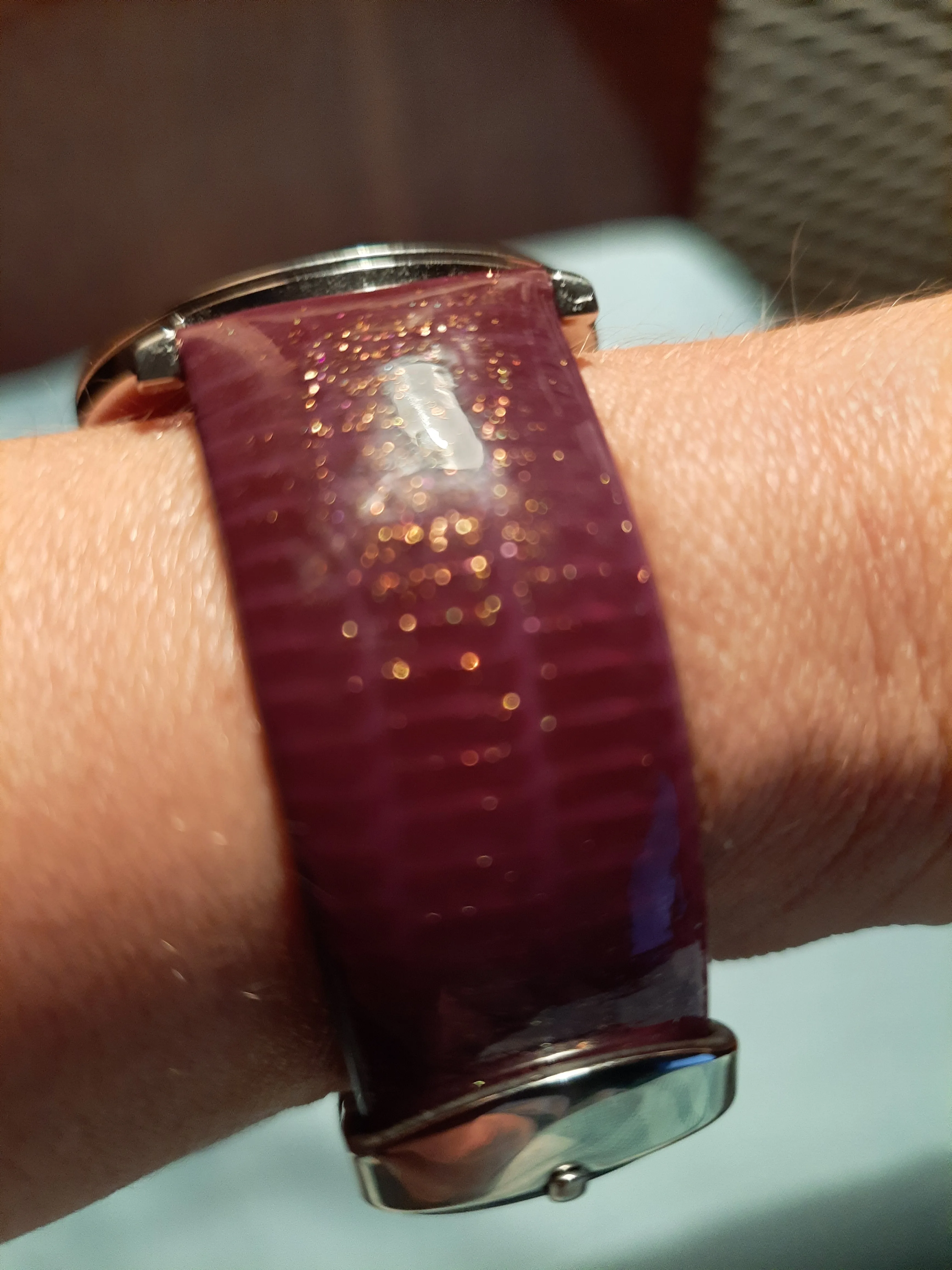 Заказывала два ремешка шириной 20 мм в фиолетовом и розовом цвете. Каждый ремешок упакован в индивидуальный пластиковый футлярчик. К заказу прилагается шпилькосъемник и запасные оси. Первое впечатление от ремешков очень приятное, сделаны качественно. Даже если это и не кожа, то исполнение очень достойное. Ремешки с блеском, как будто на основной цвет нанесен золотистый шиммер. При дневном свете блеск менее заметен. Доставка в Минск - 50 дней, долго, но это больше проблемы белорусской почты.