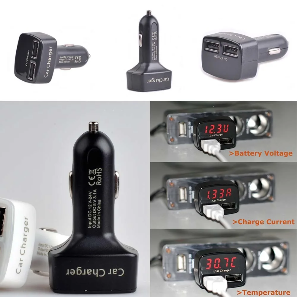 Автомобильное зарядное устройство 4 в 1 с индикатором напряжения/температурным дисплеем/двойным USB-портом для зарядки