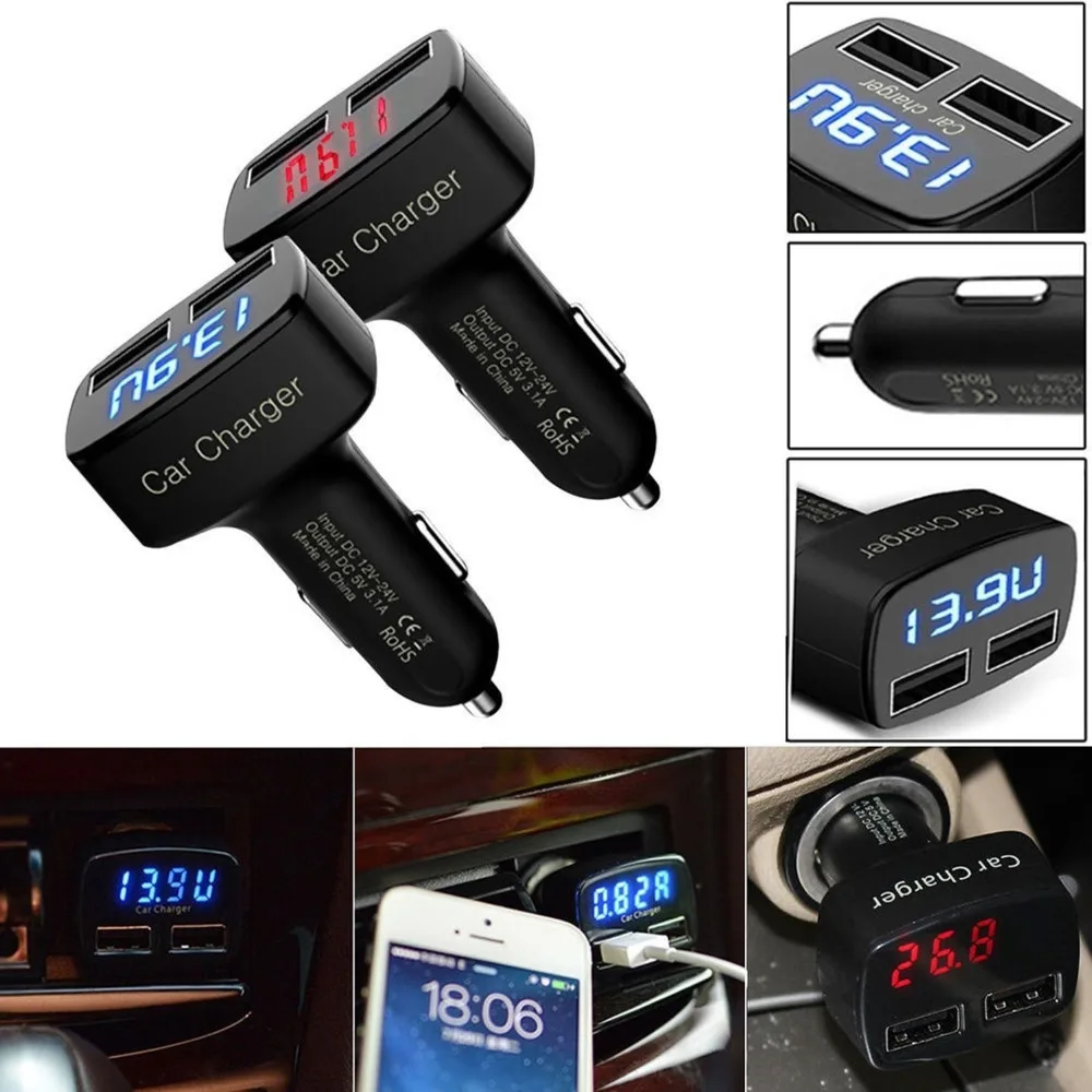 Автомобильное зарядное устройство 4 в 1, вольтметр, термометр с двумя USB-портами и цифровым дисплеем, 12 В, 24 В, для автомобиля, планшета, смартфона