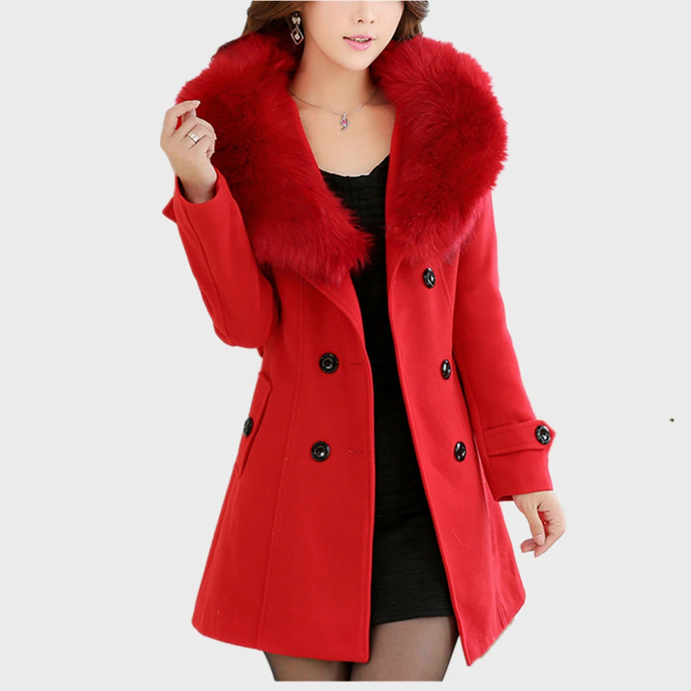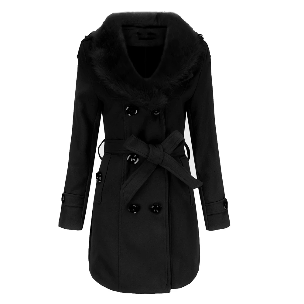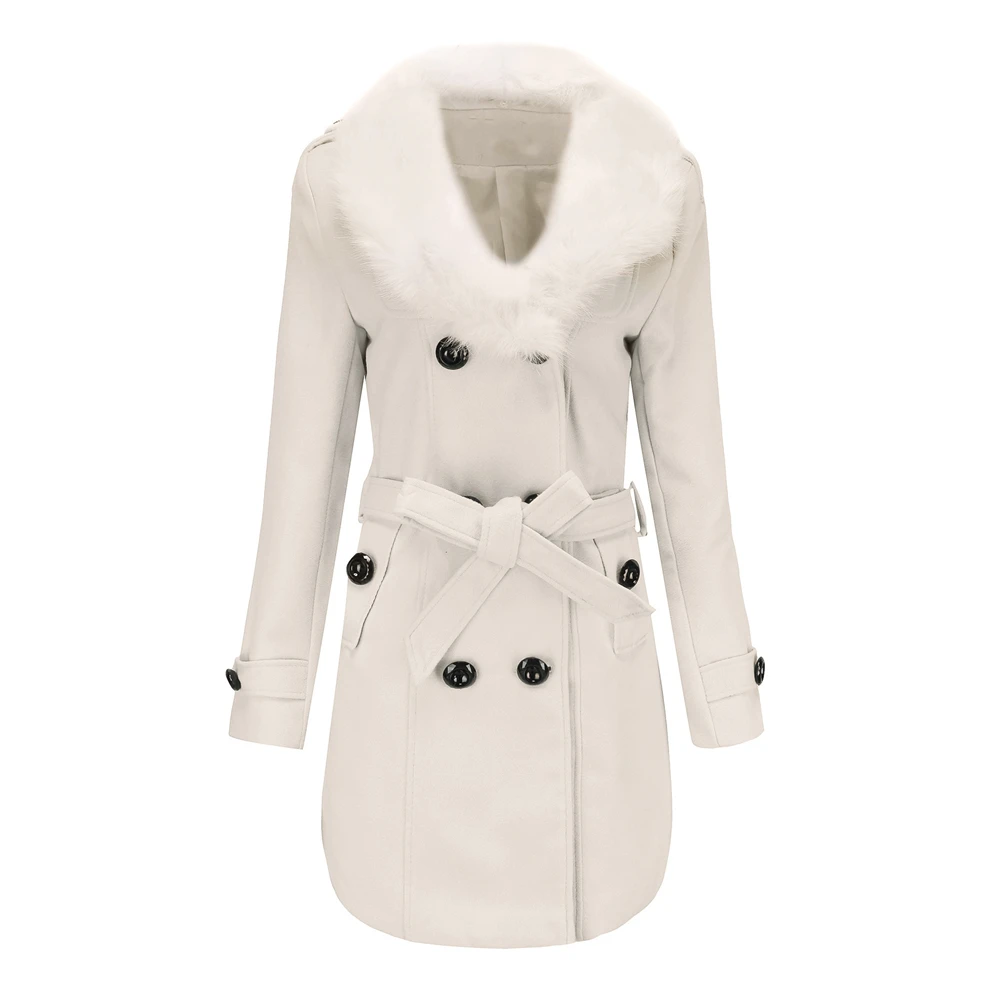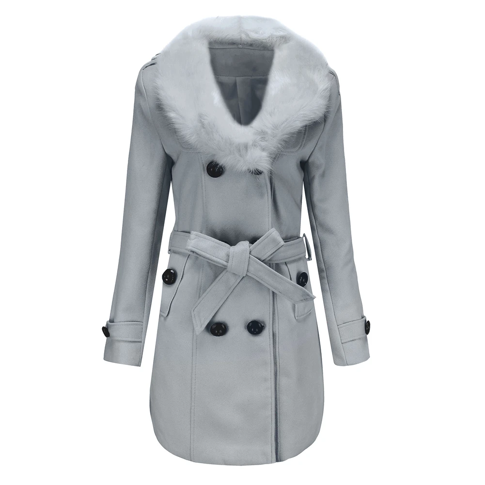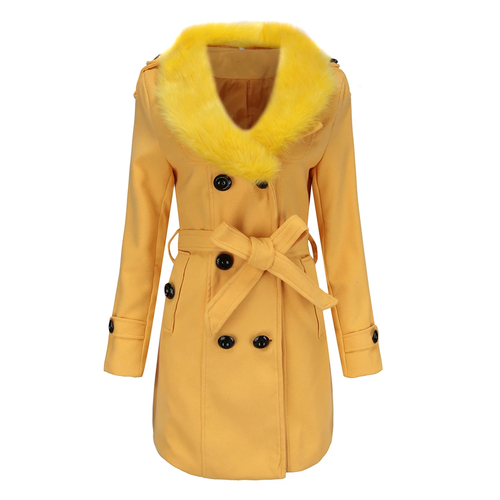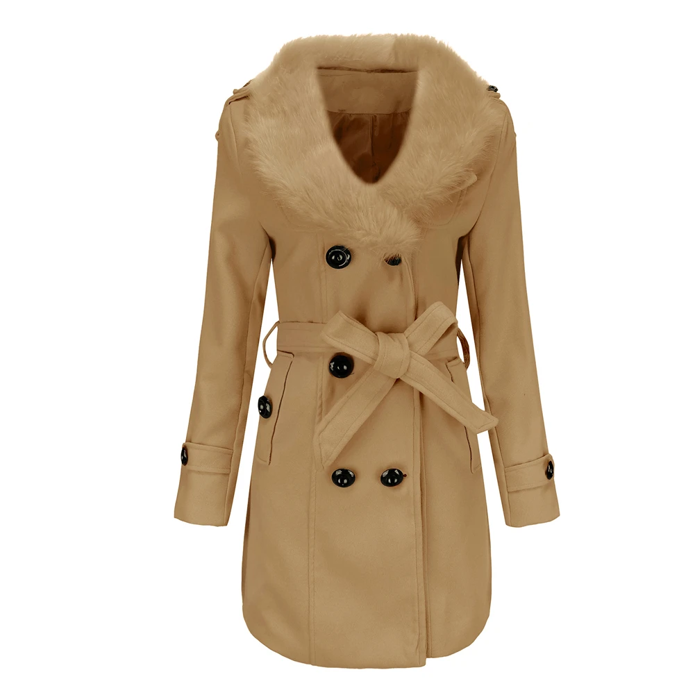 Женское двубортное пальто с меховым воротником, весна-осень