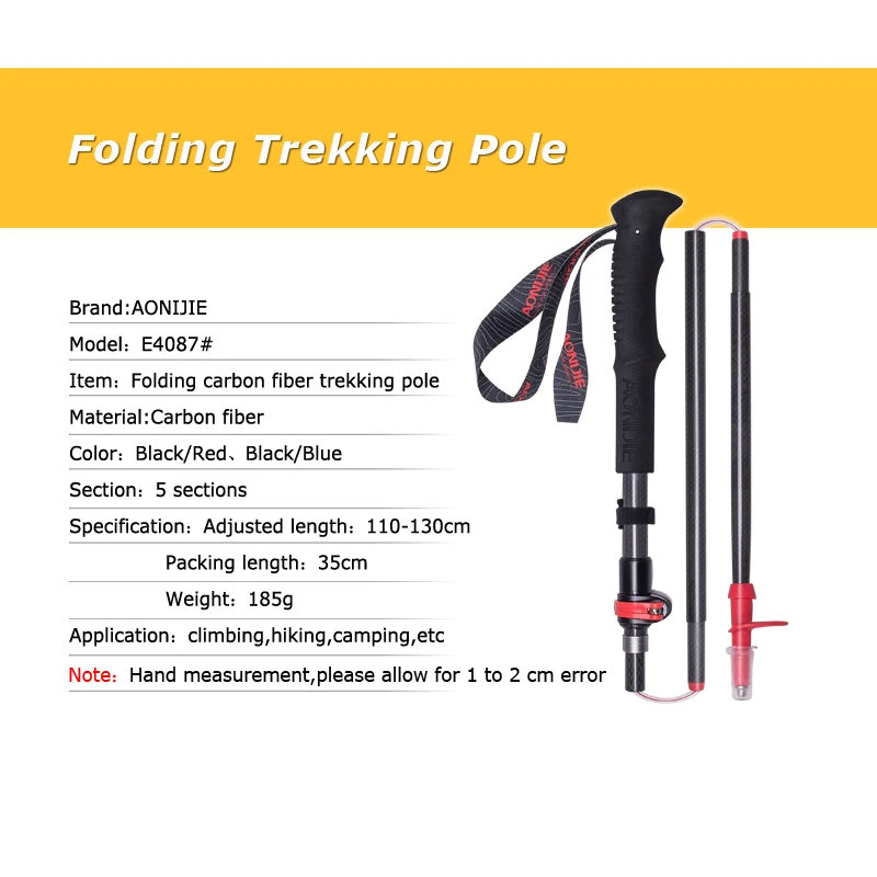 Особенности:Он изготовлен из углеродного волокна, который прочнее и легкийРучка из пены EVA, нескользящая, впитывающая пот и более удобная.Регулируемый ремешок для запястья полезен для сохранения его в сторонеСистема быстрого замка-Регулируемая от 43 до 51 дюймов/110 до 130 см с легкостью, удлиняет и сокращает за считанные секундыС сетчатой сумкой для удобной переноски.Описание:Бренд: AONIJIEНомер модели: E4087Название: складной полюс из углеродного волокнаМатериал: углеродное волокноРазмер: длина сложения 35 см, длина расширения 130 смЦвета: черный/синий, задний/КрасныйВес: только 185 гСекции: 5Посылка:1x E4087 треккинг Полюс