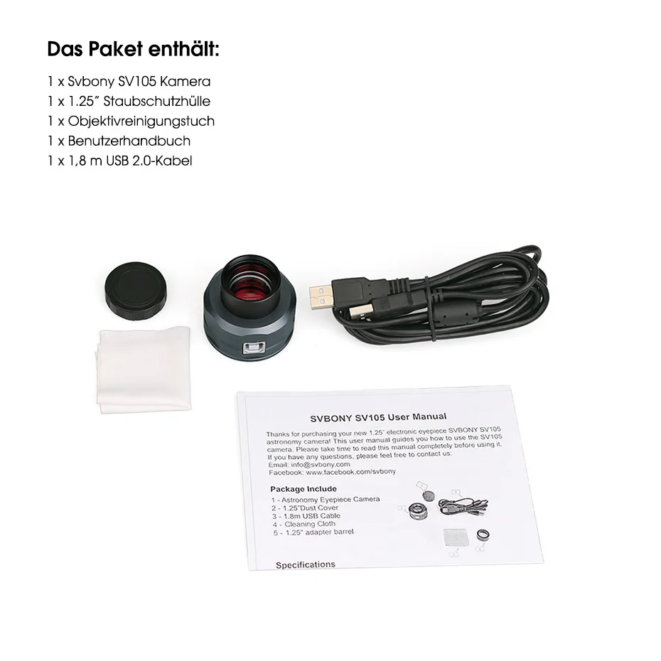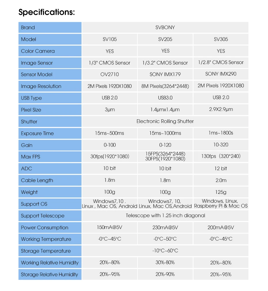 Камера Sv105 отличная! Особенности: отличное разрешение 2 Мп, что производит высококачественные изображения! Прочная конструкция из алюминия, хотя и легкая и очень компактная. Быстрое подключение подключи и работай. Usb-кабель A-B с разумной длиной (1,80 м). Снимайте отличные изображения луны и планет через телескоп. При регулировке, может обеспечить наблюдение за небесными телами менее яркими (ex: гранулы звезд). Но может генерировать Электронный шум, но устройство не рекомендуется для него. Дополнительные точки: для телескопа Луна видна в деталях с фотографиями качества. Рекомендуется использовать фильтр (нейтральная плотность) с резьбой в sv105, чтобы уменьшить яркость (блики) лунного света и иметь более ограниченное количество. С правильными настройками, планетарные изображения отлично подходят для разрешения, контрастности и деталей. Примечание: защитный чехол для камеры имеет небольшой зазор. При нанесении внутренней кромки клейкая лента изоляционная крышка будет жесткой.
