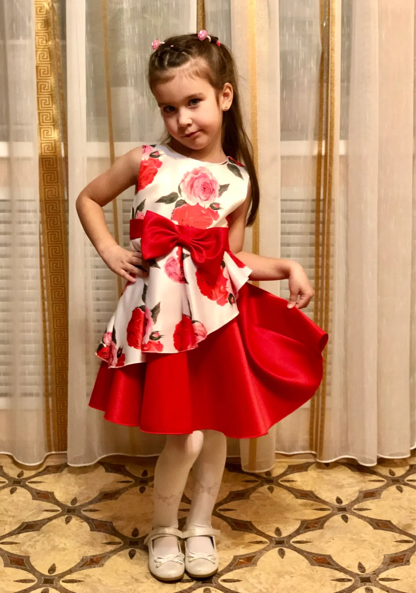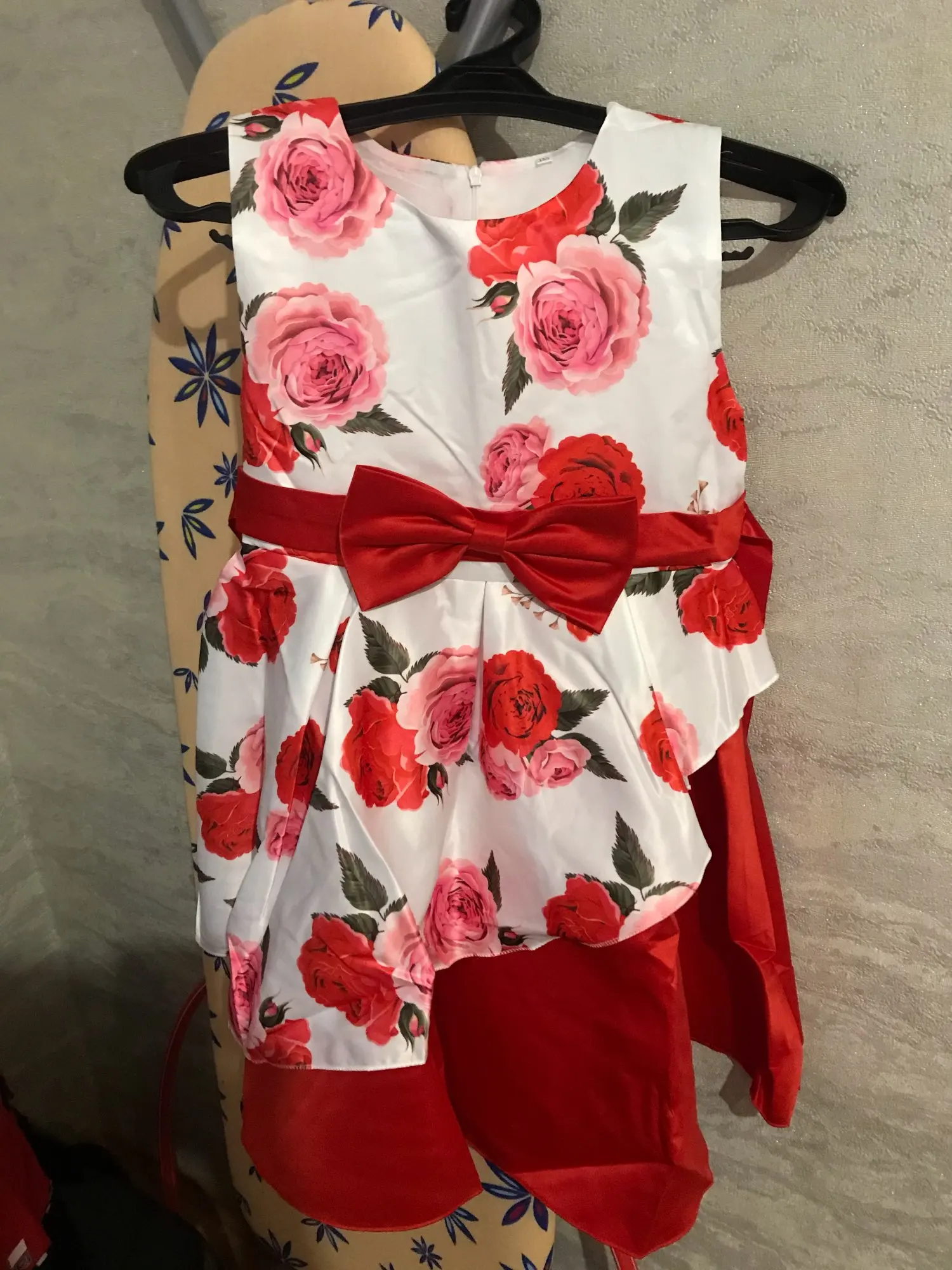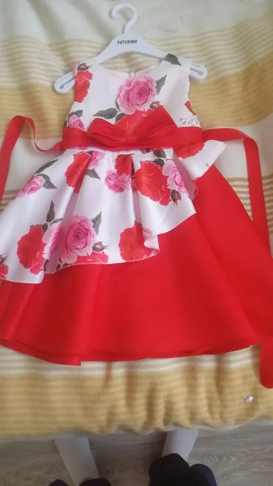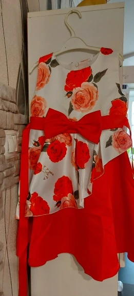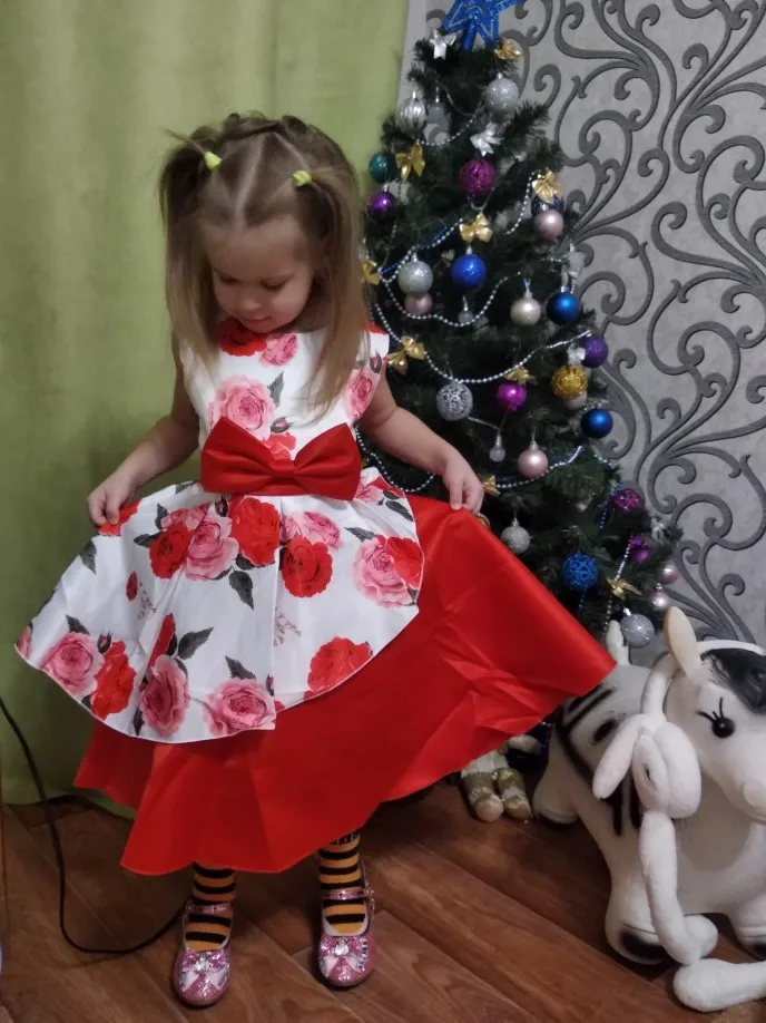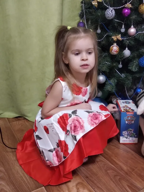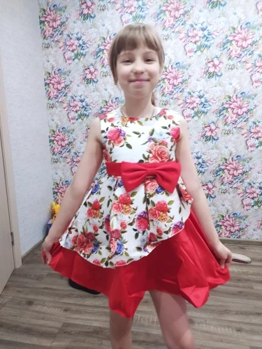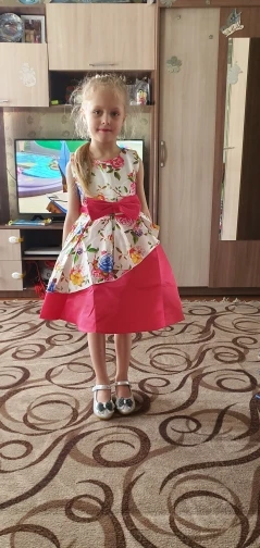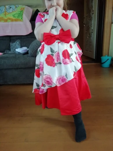 платье красивое, как в описании. цвет алый, принт красивый. С размером чуть ошиблась, великовато. На 7 лет, рост 130-135 надо брать 7, а я заказала 8. В остальном, все хорошо, есть тонкий подклад из хлопка, сама ткать платья жёсткая, хорошо держит форму, к швам есть претензии, но не критично. Шел товар 3 недели.