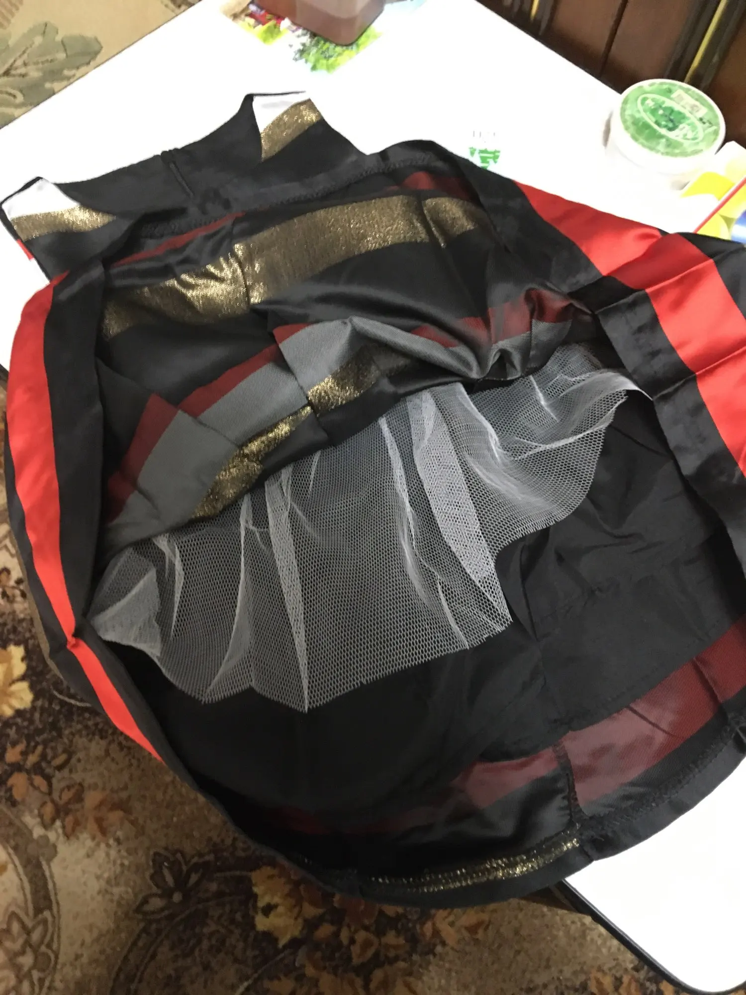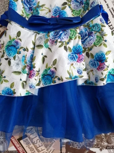 Платье очень красивое, ткань плотная, не атлас, с потайным рисунком. Подклад верха хб, юбки-синтетика (подклад очная ткань на всём подоле+2 слоя сетки и баска). На рост 116 взяла 130, с небольшим запасом. К сожалению на подоле брак, кривой.
