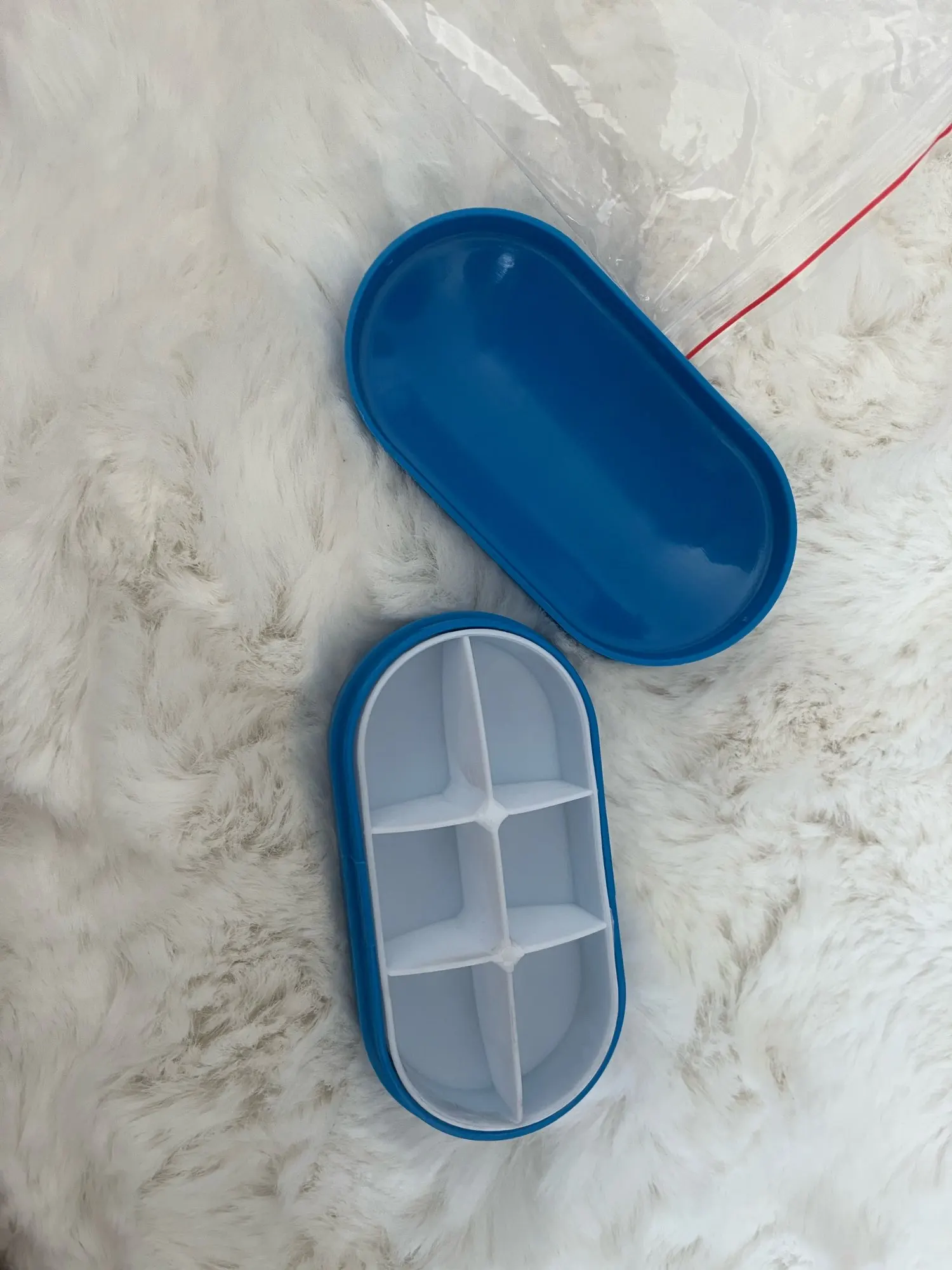 Это не очень полезно в качестве футляра для таблеток. Таблетки смешиваются внутри, они не помещаются в их отсеках, если коробка перемещена (как это происходит внутри кошелька или в вашем багаже аэропорта). Отделения внутри коробки не доходят до верхней части корпуса, и это делает все таблетки смешанными.