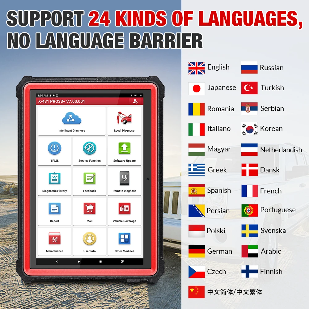 X431 PRO3S+ LanguageItalian, English, Chinese Simplified, Chinese Traditional, German, Japanese, Russian, French, Spanish, Portuguese, Polish, Turkish, Dutch, Greek, Hungarian, Arabic, Danish, Korean, Persian , Romanian, Serbian, Finnish, Swedish, Czech