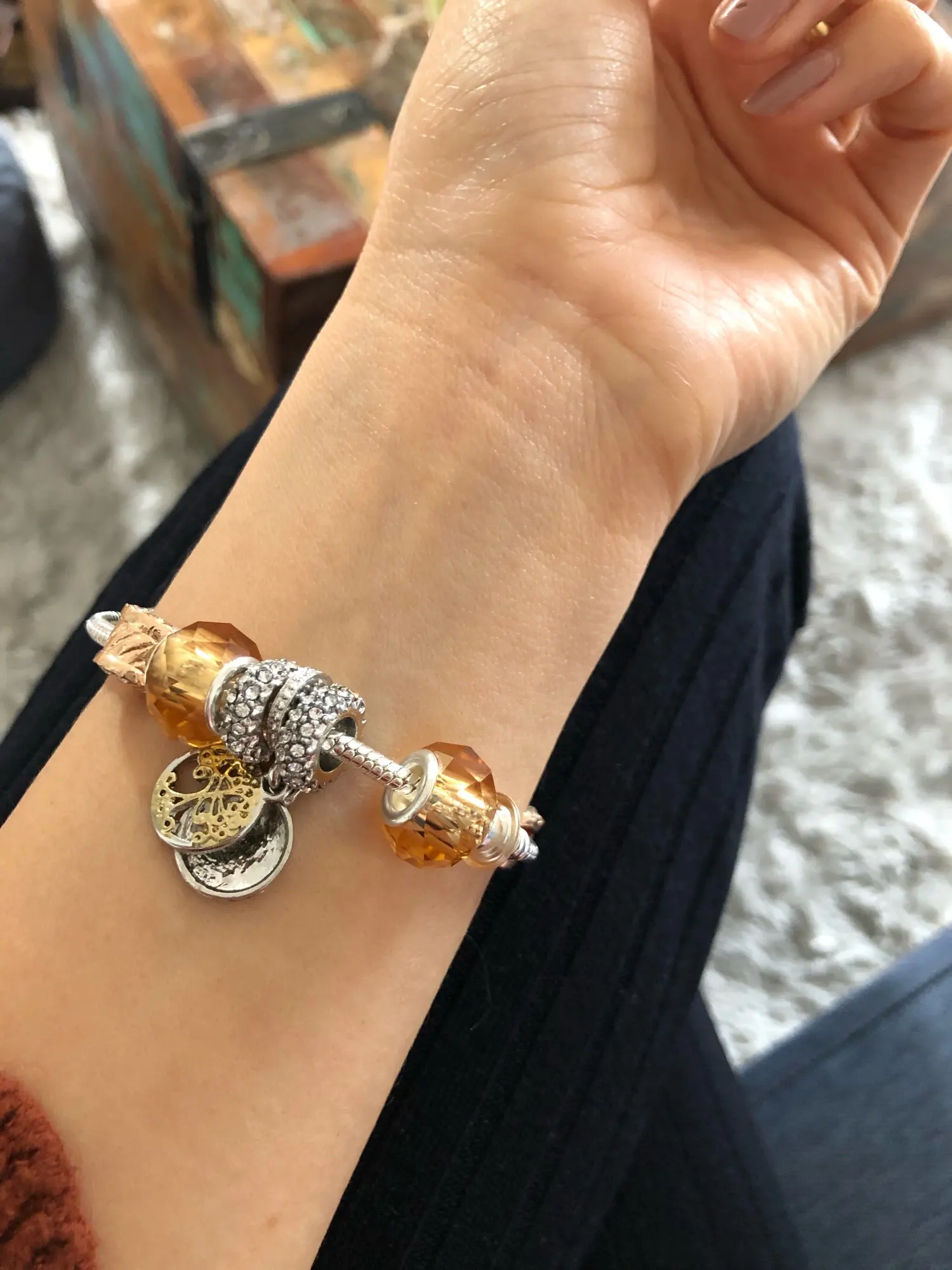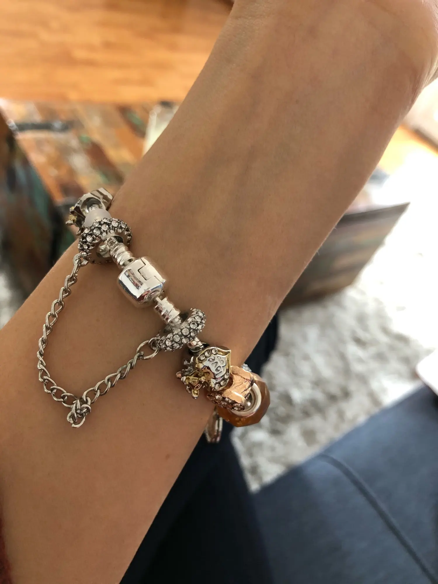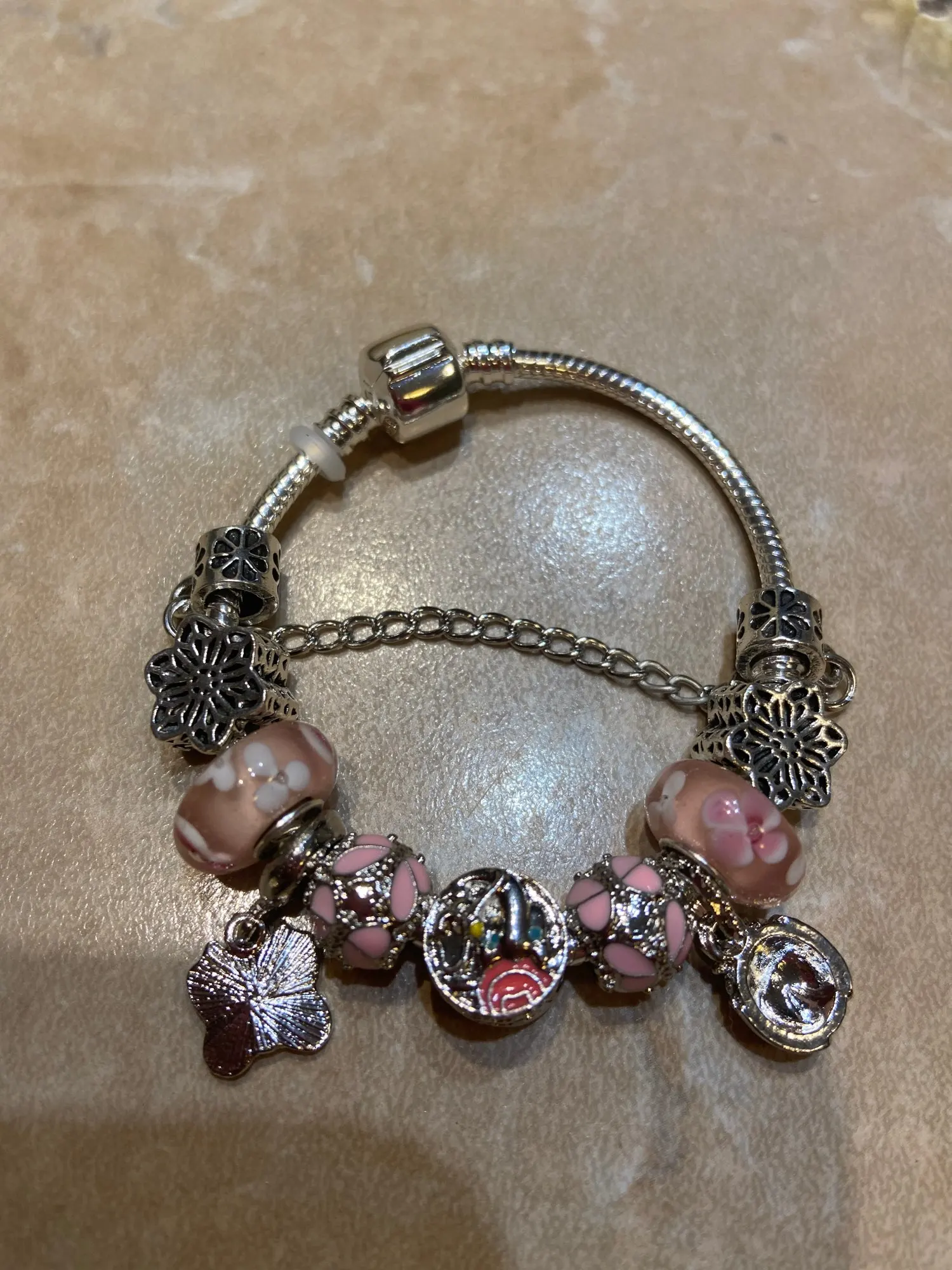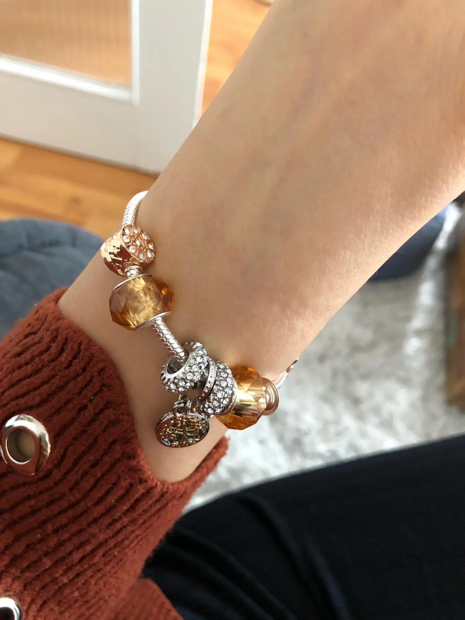 Красивый браслет! Наконец-то в моей руке примерно через 1 месяц (Франция). Я вынул несколько бусин, которые мне не очень нравятся, и добавил очарования, которые у меня есть. Очень доволен этим браслетом. (В застежках имеется надпись «925»). Мое запястье 15 см, и я купил 17 см. Немного слишком свободно для меня, мне нравится довольно туго. Я думаю, что закажу еще один браслет размером 16 см