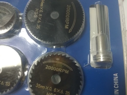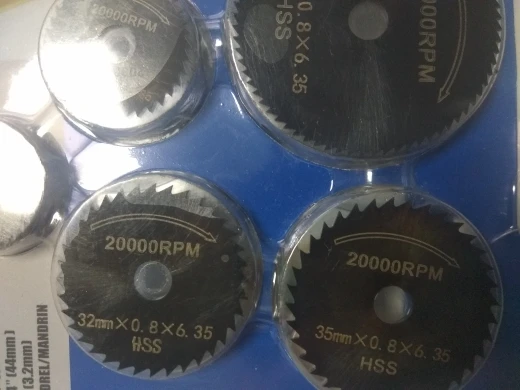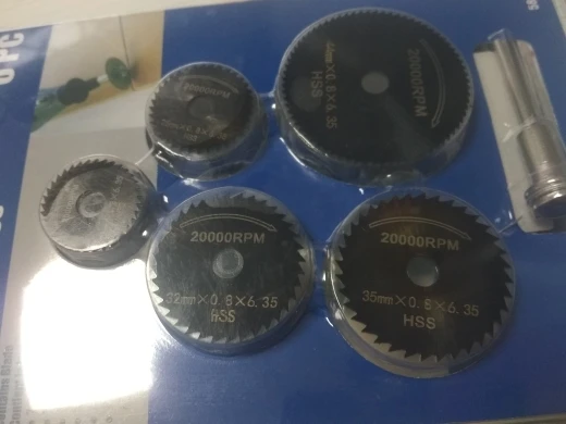 Спецификация: 1. Тип: пильные полотна из быстрорежущей стали 2. Материал: быстрорежущая сталь3.Максимальные обороты: 20000. 4. Диаметр отверстия: 6,35 мм 5. Размер: (22/25/32/35/44)* 1*6,35 мм 6. Диаметр удлинителя: 3,175 мм