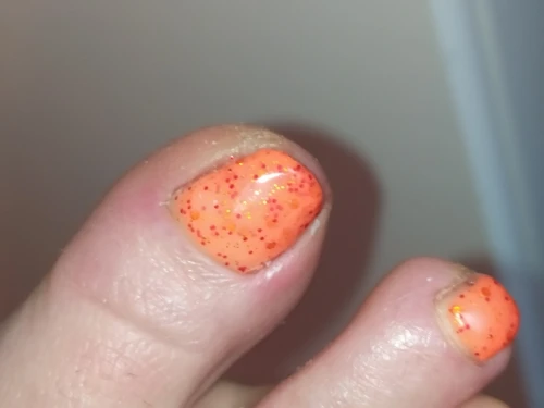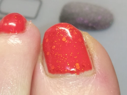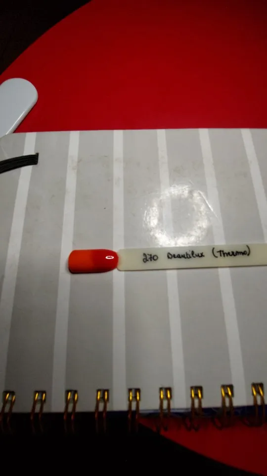 Посылка пришла в срок, не отслеживалась. Лак яркий в меру густой. А по цвету я не заметила что это термолак. В холодном состоянии он ярко красный (фото номер 1), а 3 и 4 фото это уже в тёплом состоянии. Особых изменений в цвете я не увидела.