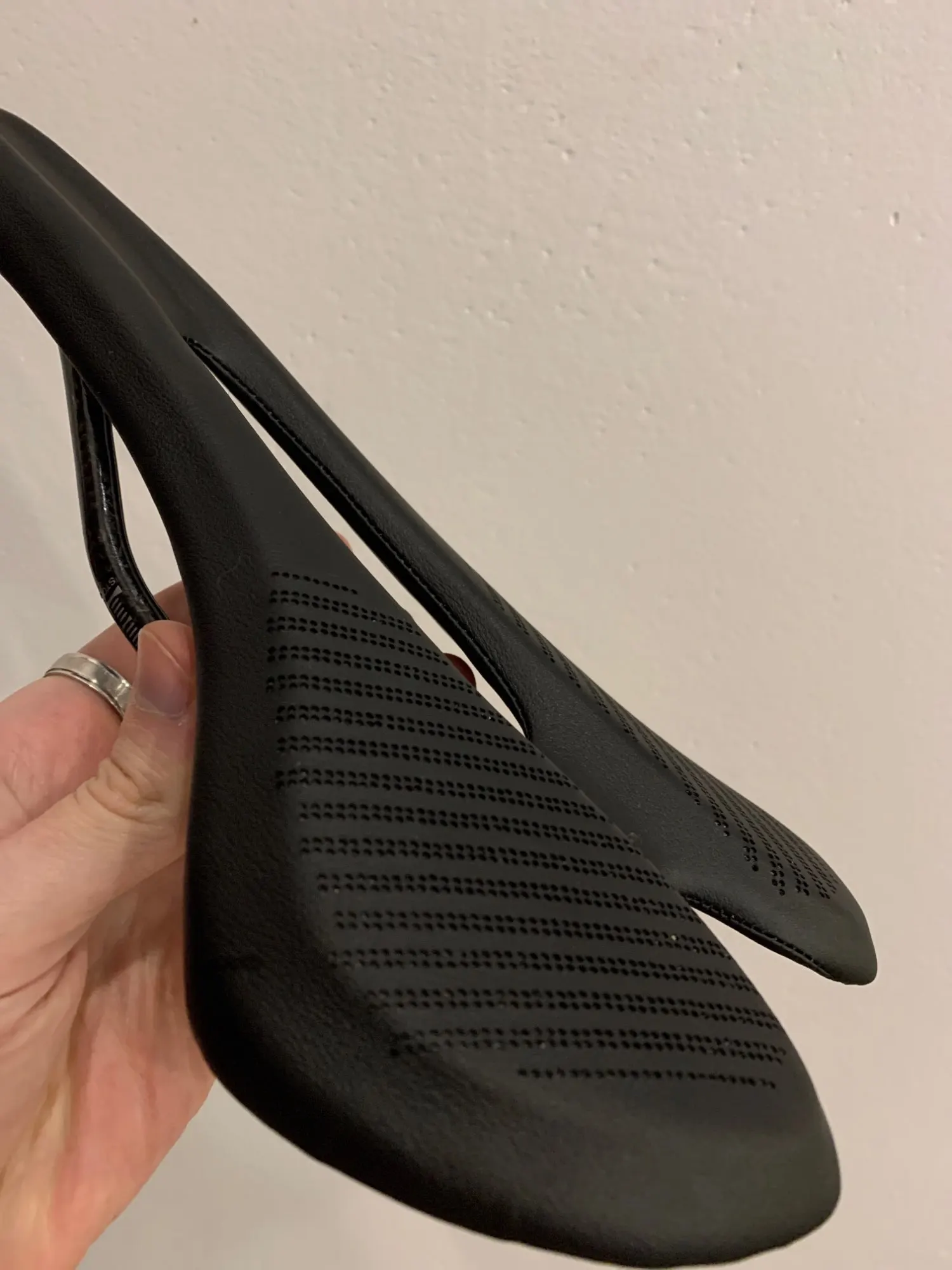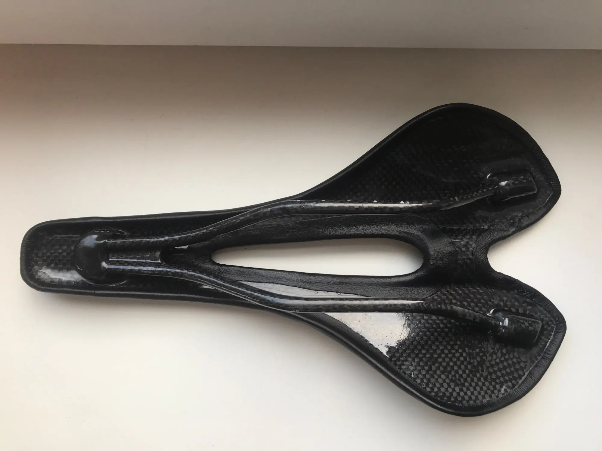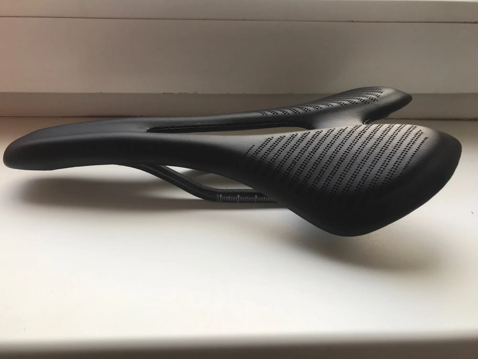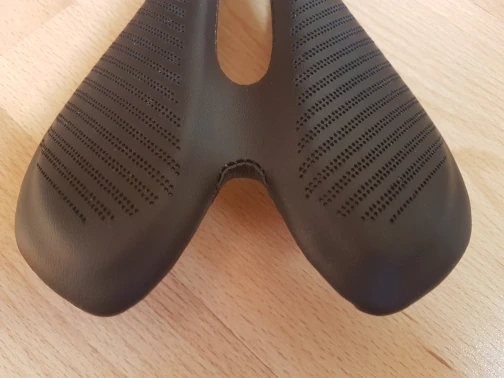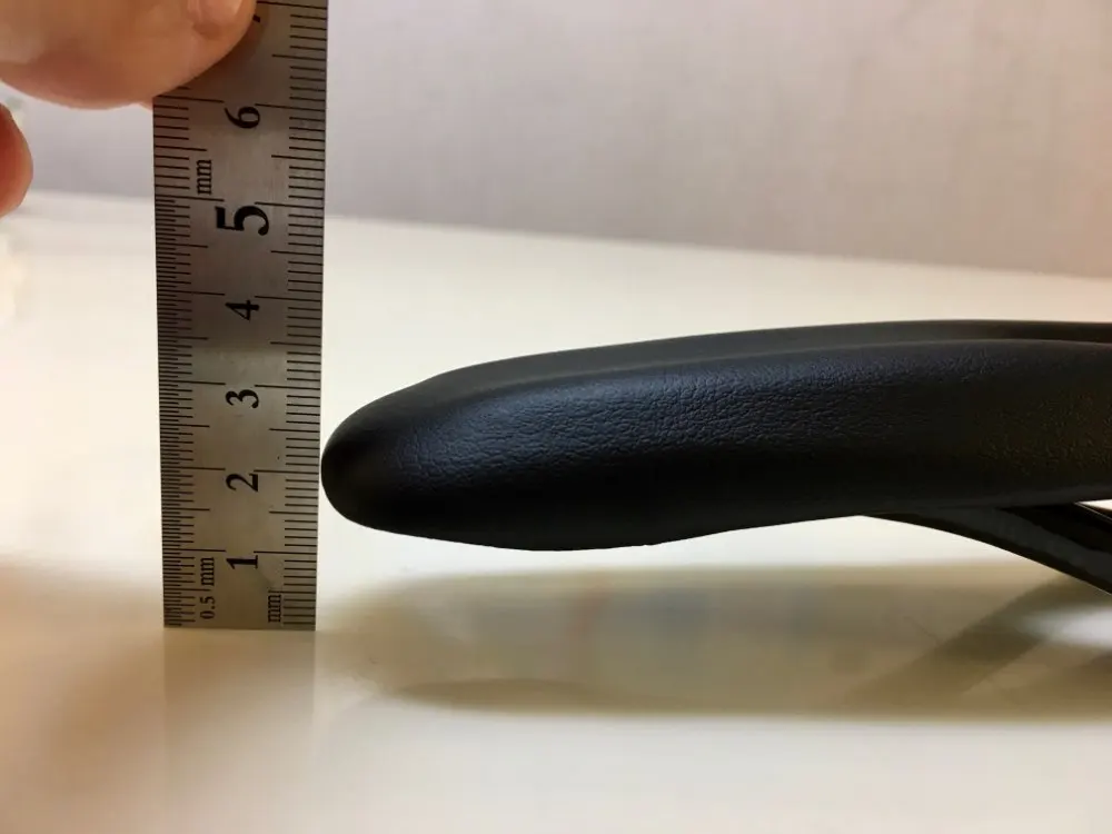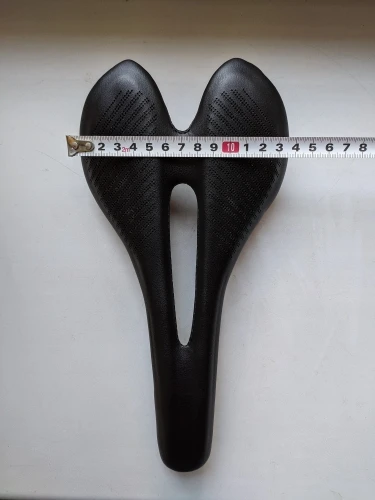 доставка 2 недели НП. на первый взгляд, отличное седло. геометрия с виду ровная, но на рельсах есть небольшая погрешность 0.5-0.7 мм по высоте и около 1 мм разница между рельсами в крайних точках. мягкий наполнитель хороший, ожидал тонкий и несущественный слой. о качестве кожзама можно будет сказать только после эксплуатации, но с виду - неплохо, строчки ровные, приклеено снизу хорошо, заломов нет. мой экземпляр весит 136 г, размеры ~270х140 мм. при надавливании руками в центр седла все весом немного флексит, считаю это плюсом. дополню отзыв после установки и обкатки (жду карбоновый подседел)