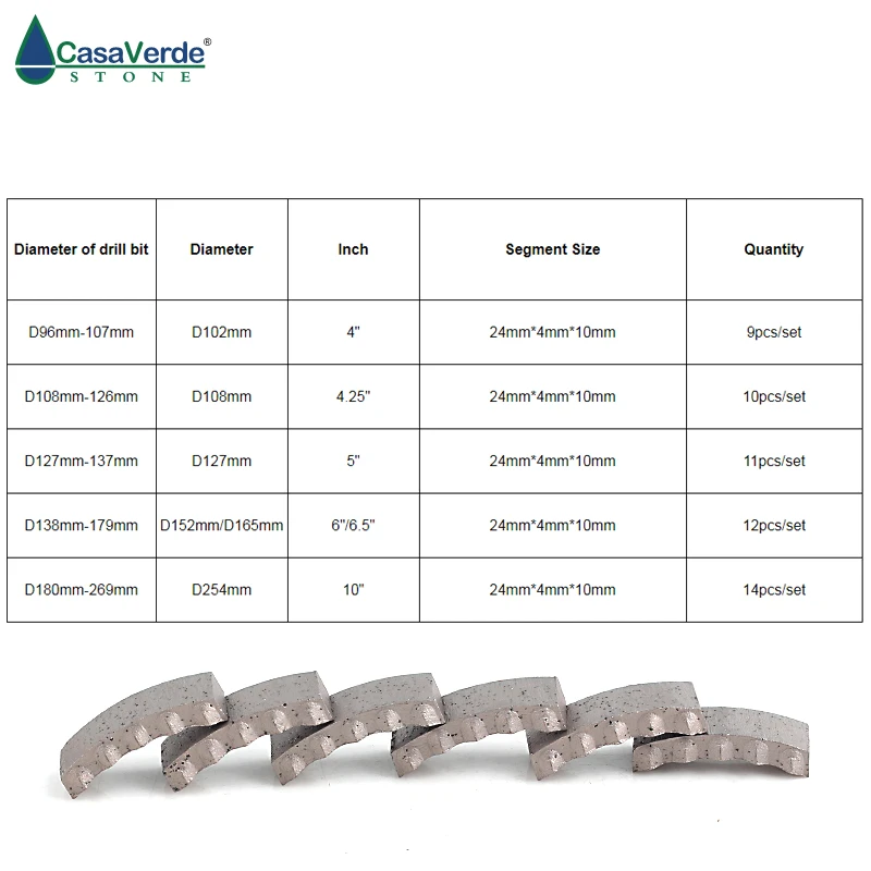 Диаметр сверла Диаметр Дюйм Размер сегмента Количество D96mm-107mm D102мм 4 дюйма 24 мм (длина) х4 мм (толщина) х10 мм (высота) 9 шт./компл. D108mm-126mm D108мм 4,25" 24 мм (длина) х4 мм (толщина) х10 мм (высота) 10 шт./партия D127mm-137mm D127мм 5" 24 мм (длина) х4 мм (толщина) х10 мм (высота) 11 шт./компл. D138mm-179mm D152мм/d165мм 6/6,5 дюйма 24 мм (длина) х4 мм (толщина) х10 мм (высота) 12 шт./компл. D180mm-269mm D254 мм 10 дюймов 24 мм (длина) х4 мм (толщина) х10 мм (высота) 14 шт./компл.