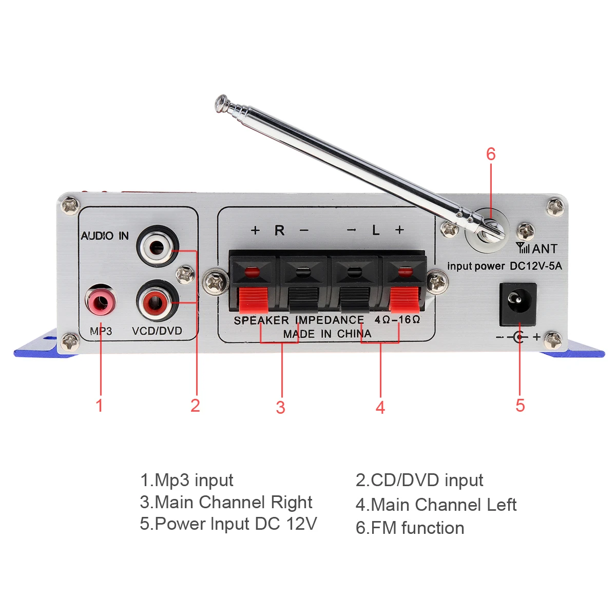 Особенности:-Цифровой дисплей в режиме звука-4-Электронная кнопочная панель управления помогает вам управлять усилитель легко.-Выберите высокомощный двухканальный Профессиональный усилитель мощности, интегральные схемы, минимальное искажение, сильная мощность.-Он может воспроизводить u-диск SD / MMC для музыки и fm-радио для автомобильного мотоцикла, поддерживает формат MP3.(USB + SD + FM)-Два выхода основного канала.-Предварительный профессиональный уровень ввода операционного усилителя IC для конструкции цепи, звука, прозрачный, яркий.-Фильтрация и анти-большая мощность цепи.-Изображение звукового поля DSP четырех.-Поддерживает воспроизведение fm-радио (FM: 87,5 ~ 108 МГц)-С входным разъемом для iPod _, MP3, CD /DVD плеера.-Дистанционное управление делает вашу работу более удобной на большом расстоянии.