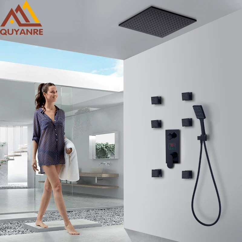 Набор черных цифровых смесителей для душа Quyanre, дождевой Душ, 6 массажных насадок, 3-сторонний цифровой дисплей, кран для ванной комнаты и душа