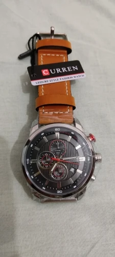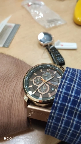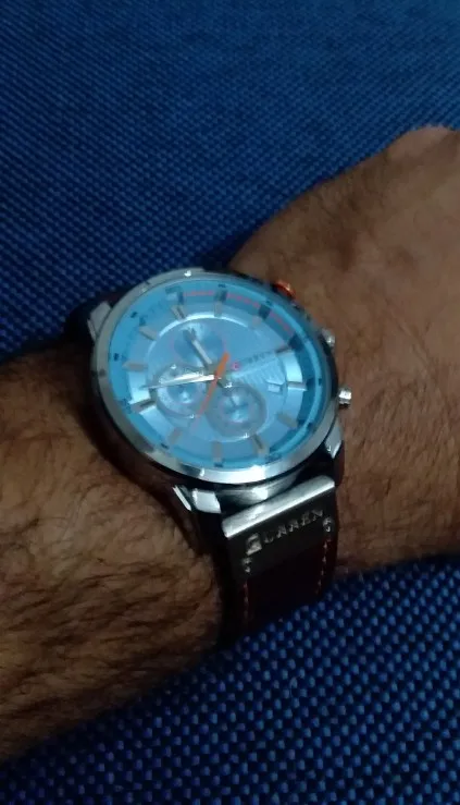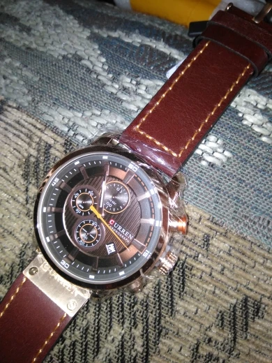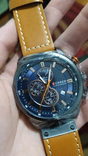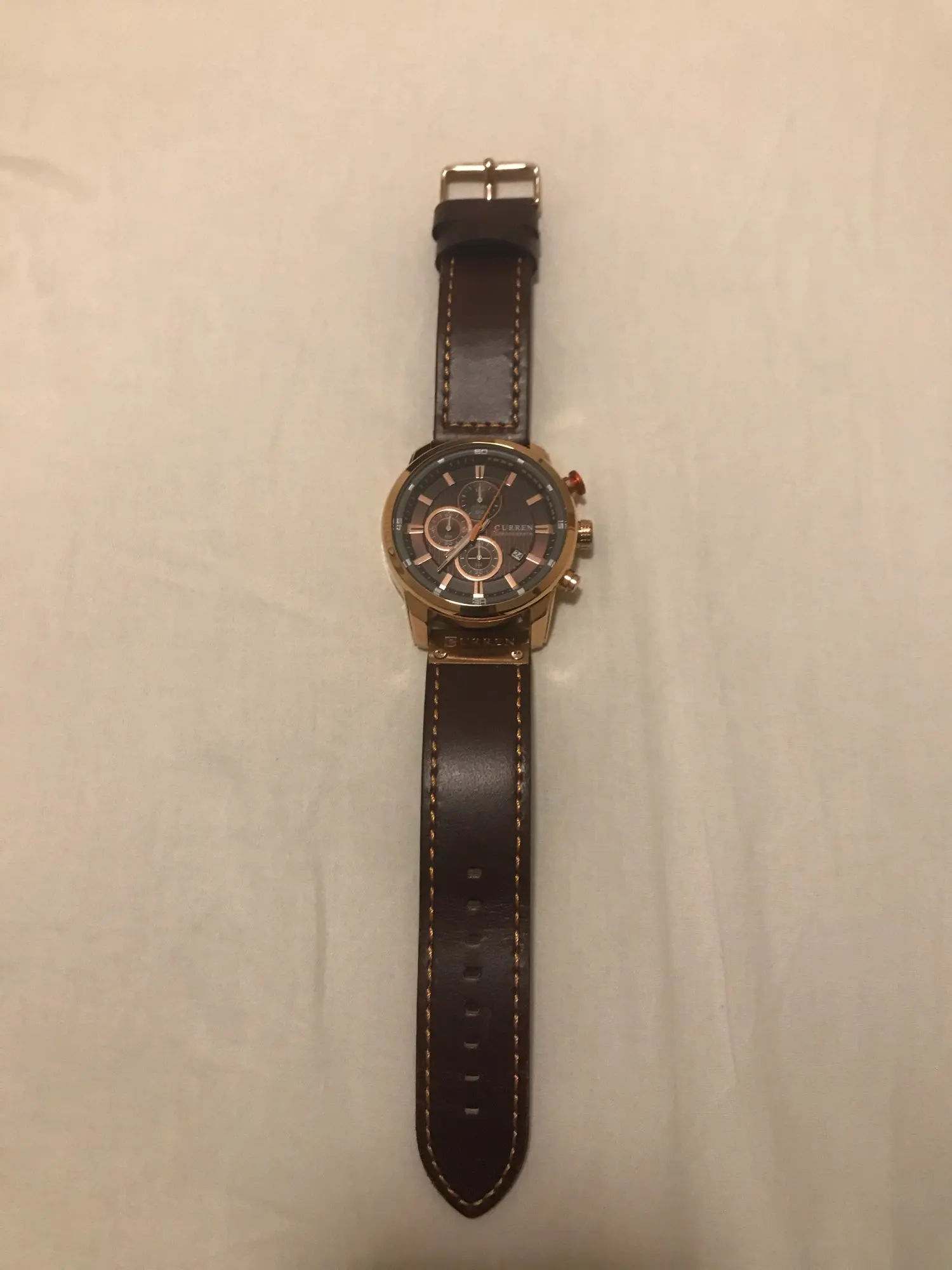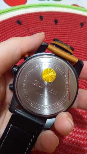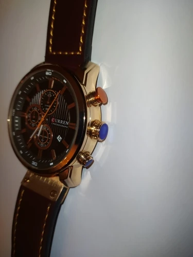 Very nice quality. Has a functioning 3 dial stop watch with lap function. Leather strap is very solid. Note: The stopwatch uses 2 stepper motors instead of 3, so the minutes dial(60 minutes for one rotation) is geared to the seconds dial(1 minute per rotation). Consequently when you reset the watch, it winds the seconds dial backward until the minutes dial is zeroed. If the stopwatch dials don't reset to Zero, you can adjust their reset position by pulling the crown out to the second position and use the top and bottom stopwatch buttons to adjust the respective dials.They work well and look good. After ordering one for myself, I ordered a bunch for Christmas presents. Excellent value. Keeps accurate time.