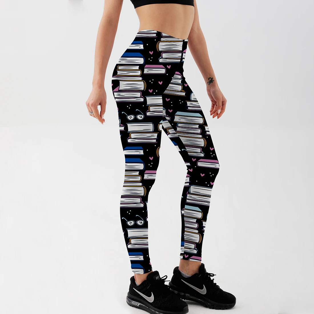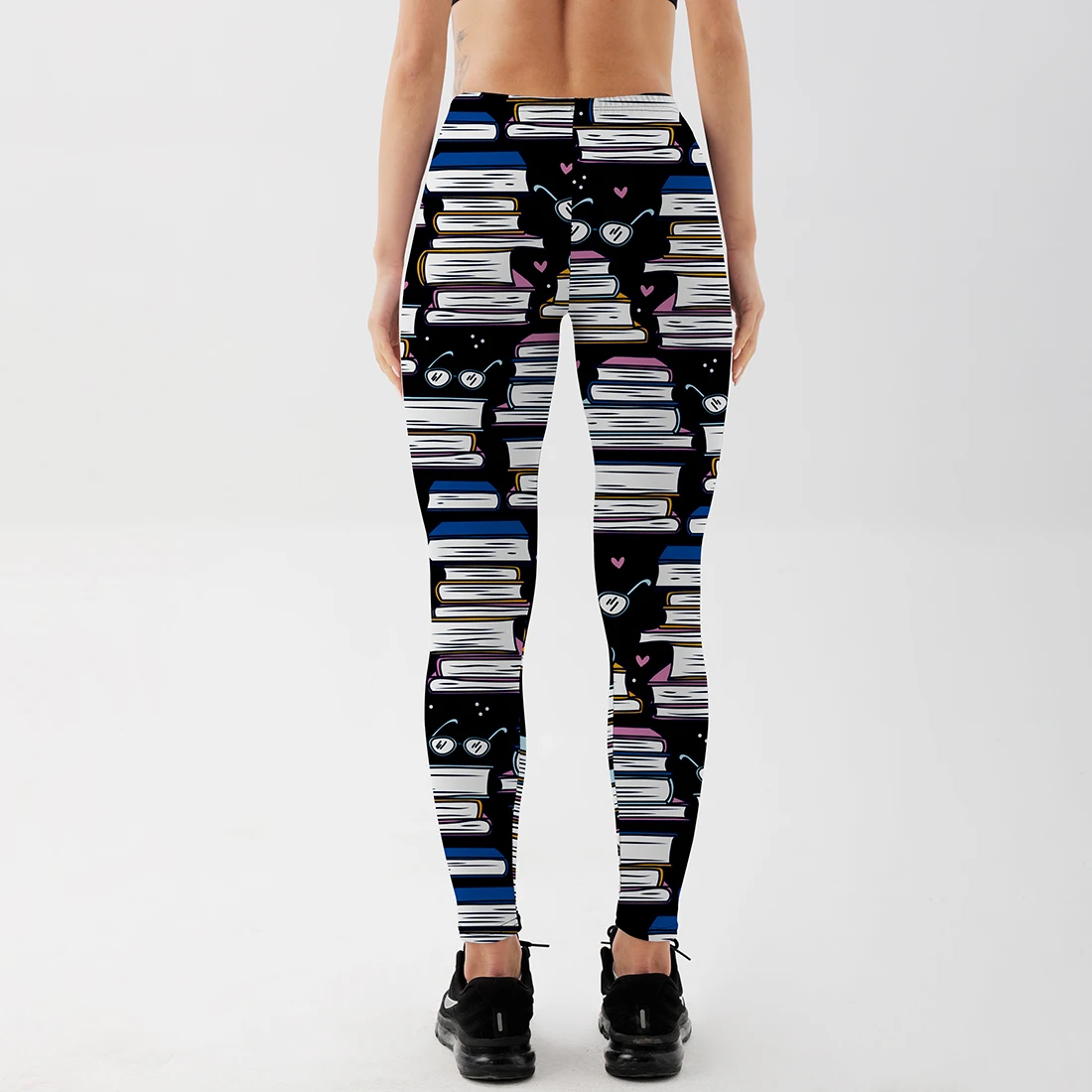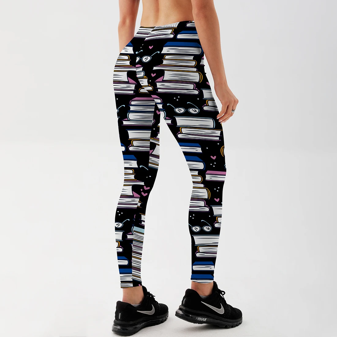 Женские леггинсы для занятий фитнесом, повседневные брюки с принтом книг и высокой талией, 2018