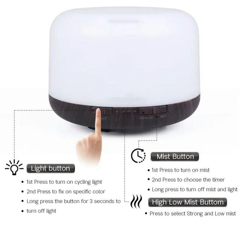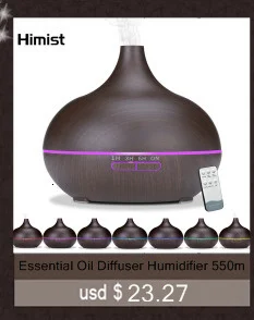 Размер продукта: 168*120 ммМощность: 13 ВтВходное и выходное напряжение: AC100-240V DC 24 0,65 мАчЕмкость: 500 млВремя работы: 1 ч/3 ч/6 ч/вкл.Материал: PP + ABS отделка под деревоУльтразвуковая частота: 2,4 МГцХарактеристика: 7 цветов освещения. Выжигания сухой ПредотвращениеКнопка тумана: Нажмите кнопку "Туман", чтобы выбрать время от 1 часа/3 часа/6 часов/стабильно.Кнопка освещения: нажмите кнопку «Light», чтобы включить светодиодный свет, и цвет будет циклически автоматически. Нажмите кнопку еще раз, чтобы вручную установить предпочтительный цвет и яркость дисплея. Удерживайте кнопку, чтобы выключить свет.Посылка включает в себяАромадиффузор-1 шт.Адаптер-1 шт.1 х мерный стакан для водыРуководство пользователя (1 шт.)(Не включая эфирные масла)