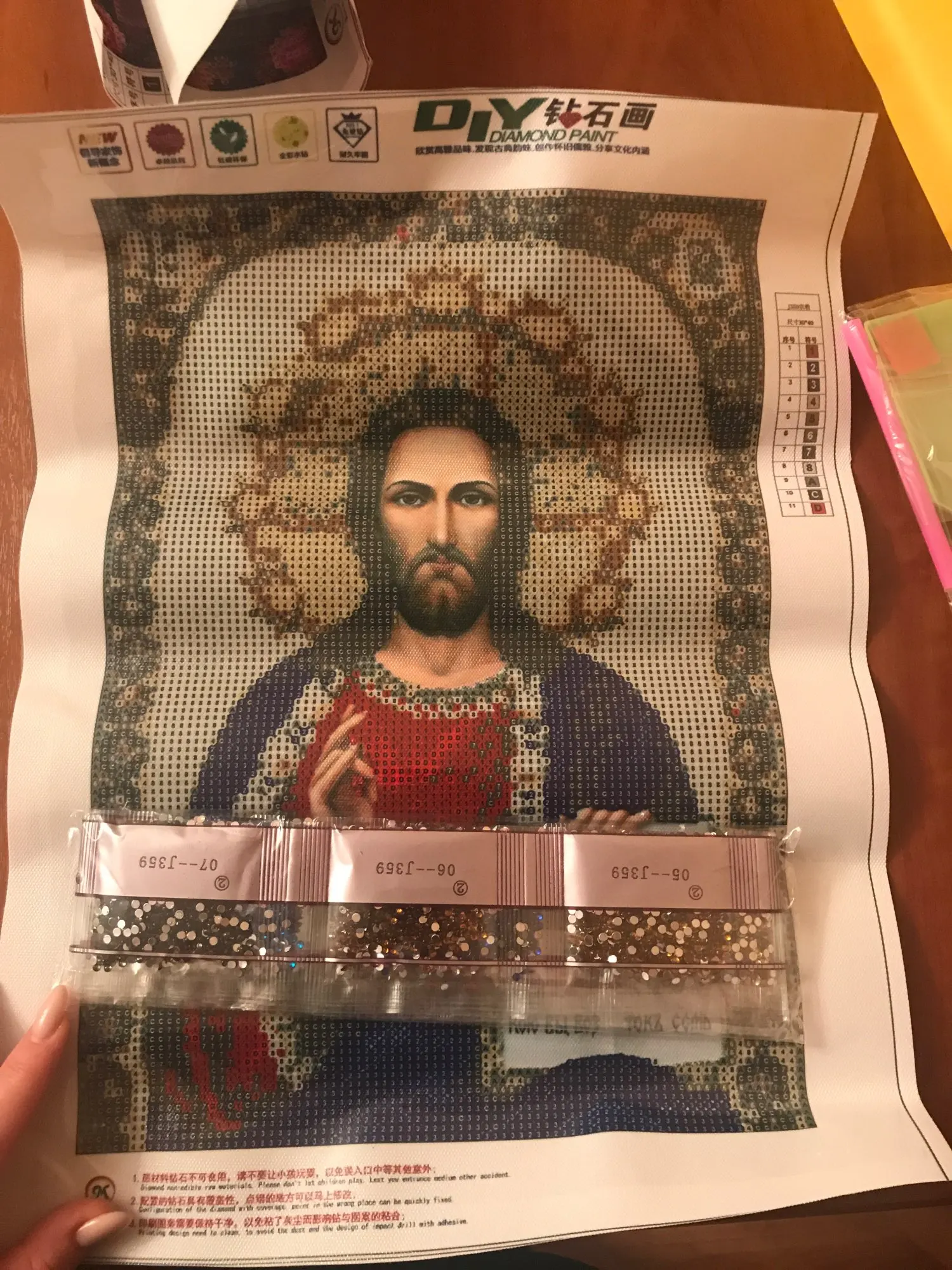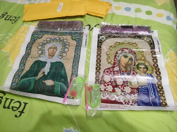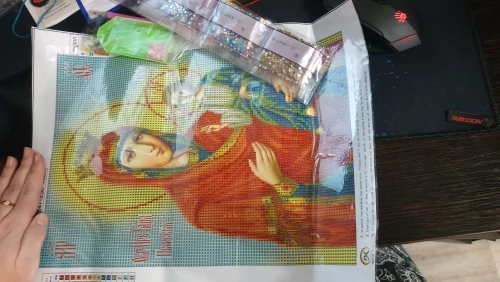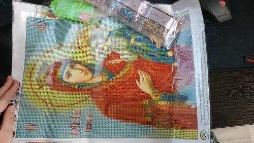 Икона пришла свернутая в рулон, есть небольшие заломы, положила под пресс, думаю, что все разгладится. Супер быстрая доставка, до Москвы за 11 дней!!! Трек отслеживался. Икона выкладывается полностью кроме рук и лица, стразы круглые блестящие, именно такие всегда кладут в иконы. Цветов всего 14., в комплекте идёт лоток доя страз, карандаш и маленький кусочек клея, готовую работу выложу позже!