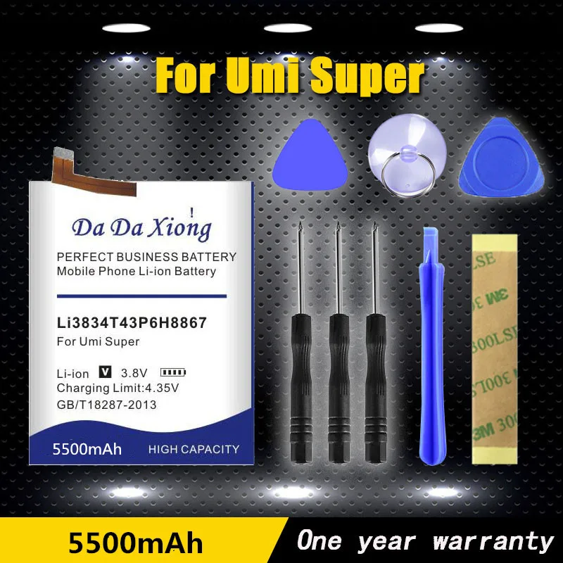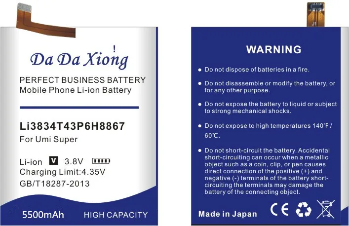 100% Оригинальный Da Xiong новый и высококачественный аккумулятор. Емкость:5500 мАч Напряжение: 3,8 V Тип: li-ion Совместимость: дляСупер батарея Umi Безопасность и окружающая среда: двойные функции защиты. Двойная электрическая плата IC и PCB защищают от разрядки заряда и короткого замыкания. Наша батарея того же размера с оригинальной батареей. Два года гарантииПосылка включает в себя: