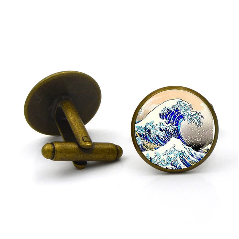 Запонки с большой волной канагава, высококачественные запонки Hokusai в японском стиле, запонки для рубашки со стеклянным куполом и фотографией, мужские Модные украшения