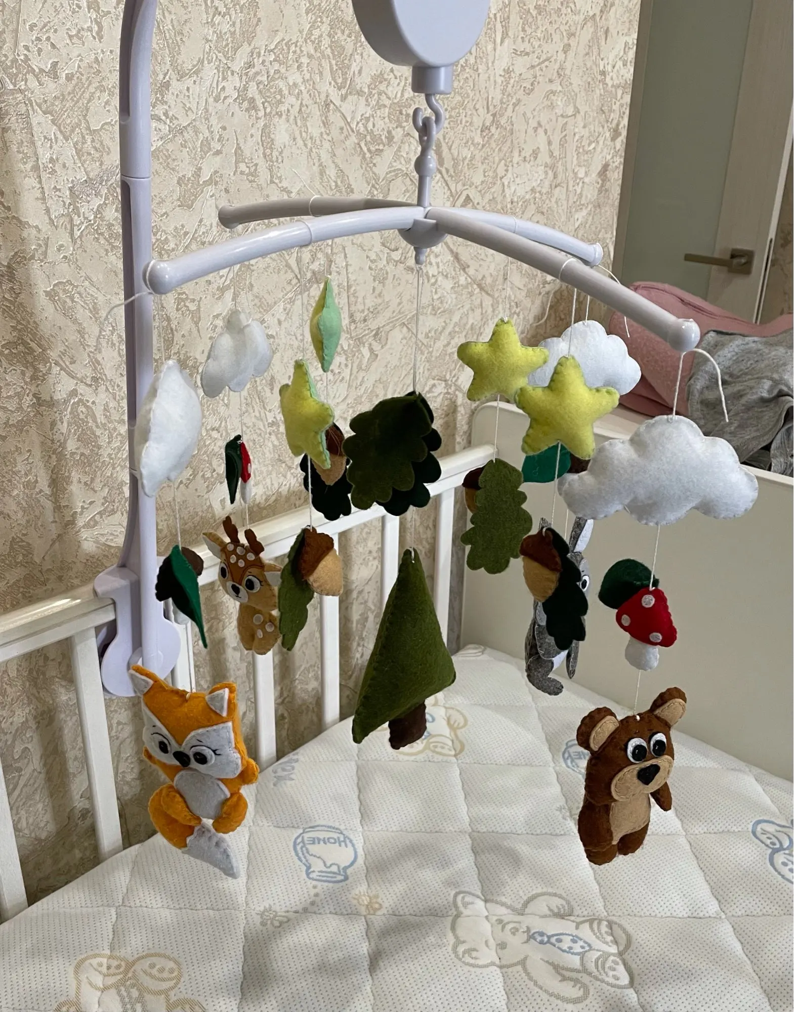 хороший, пришел целый, собирается легко, надёжно закрепляется на кроватку, приятная мелодия, малышу очень понравилась, единственный минус - через две недели начал барахлить блок с музыкой, заедает или вообще не включается.