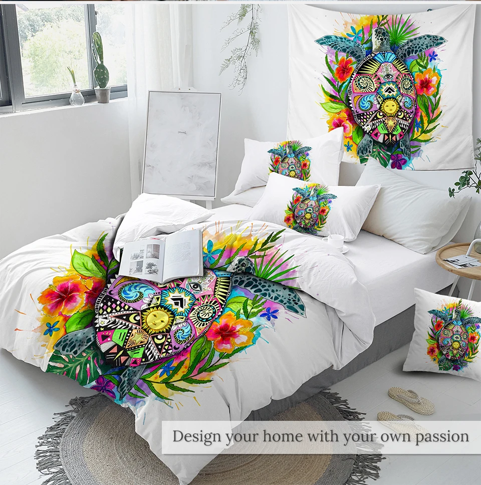 Комплект постельного белья с рисунком черепахи из мультфильма "Черепаха жизнь Пикси" в богемном стиле, набор пододеяльников с цветными цветами, постельное белье из 3 предметов, домашний текстиль
