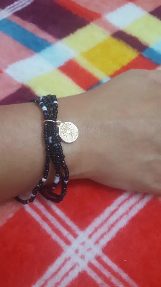 На фотографии выглядит более дорого, чем на самом деле, но буду носить. Сделан из разноцветного пластмассового бисера с шармиками.