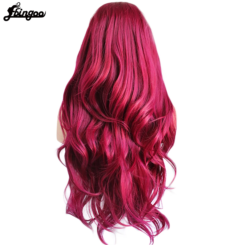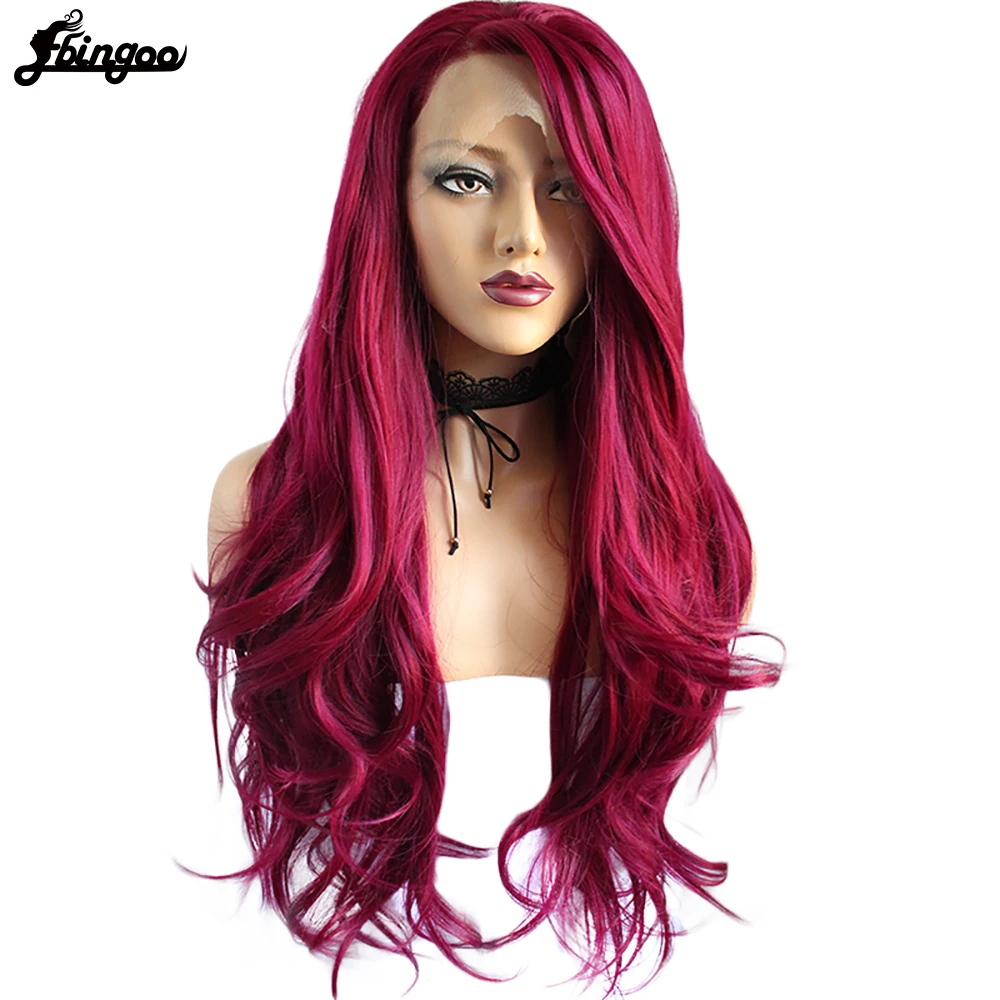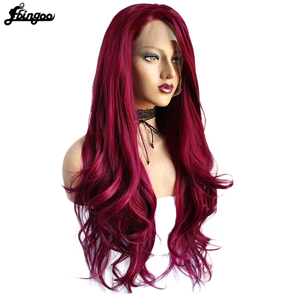 Ebingoo T часть синтетические кружева передний парик Термостойкое волокно бордовый длинный естественный тело волна винный красный для женщин