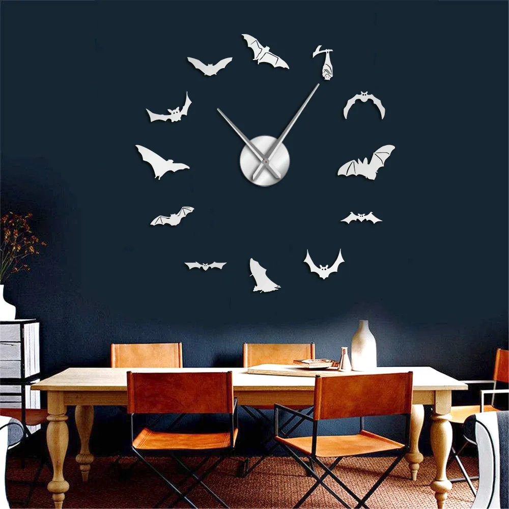 Большие настенные часы летучие мыши, современный дизайн, домашние украшения для Хэллоуина, сделай сам, бескаркасные гигантские настенные часы, зеркальные настенные часы для летучих мышей