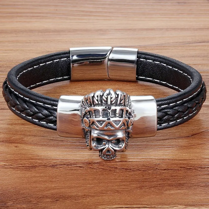 Браслет мужской кожаный, аксессуар с изображением черепа из нержаве...