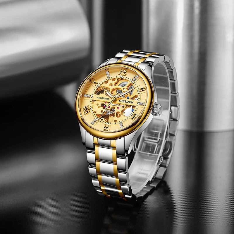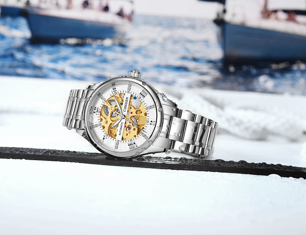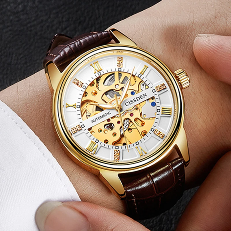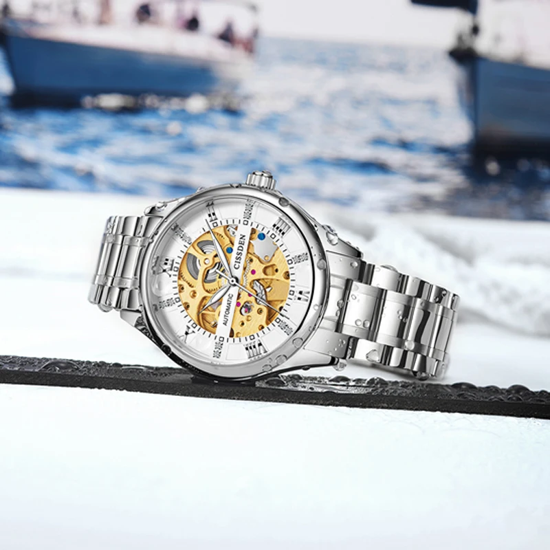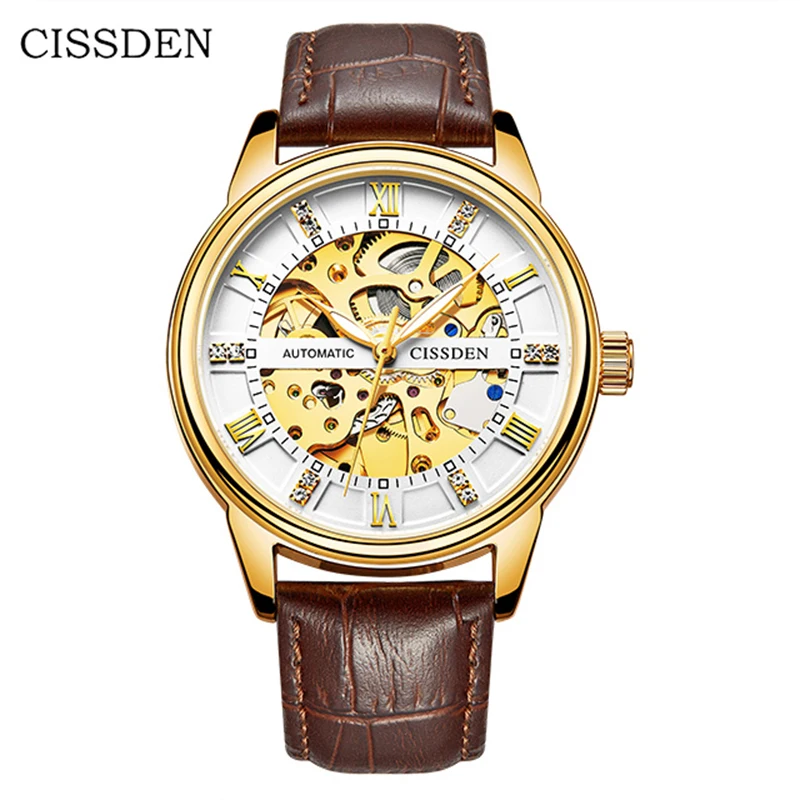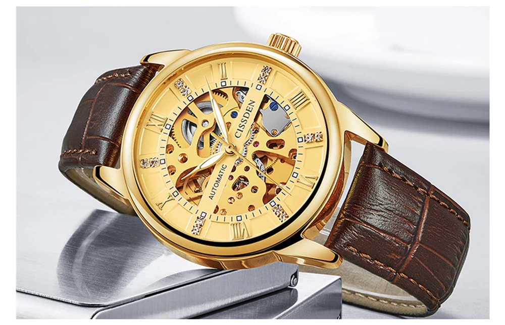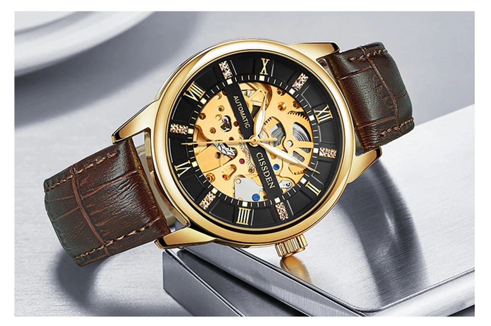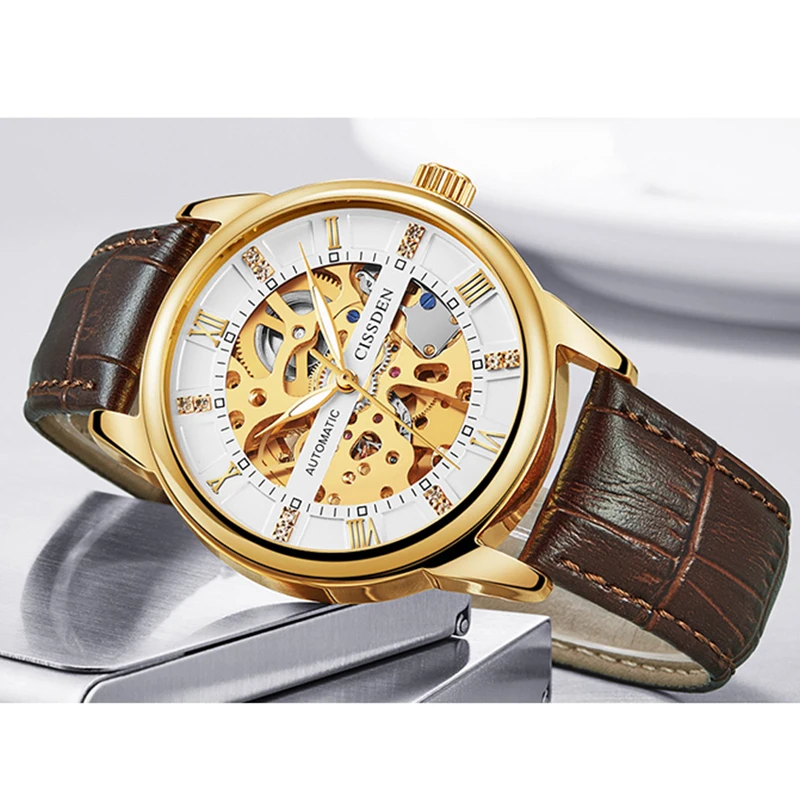 Часы-скелетоны CISSDEN Мужские механические, водонепроницаемые, золотистые, 2022