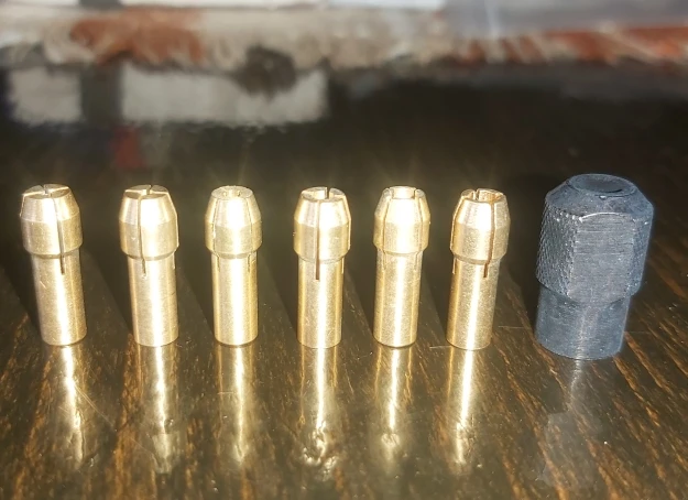 Warning: nothing fits on Dremel 3000, nor the M8 black piece (stated on the site) nor the 7 bronze tweezers. I knew the black piece wouldn't fit, but I thought the bronze tweezers won't pose a problem. In the picture you can see that the whole set (lower row) is a slight different size (larger diameter) then original Dremel (upper row)
