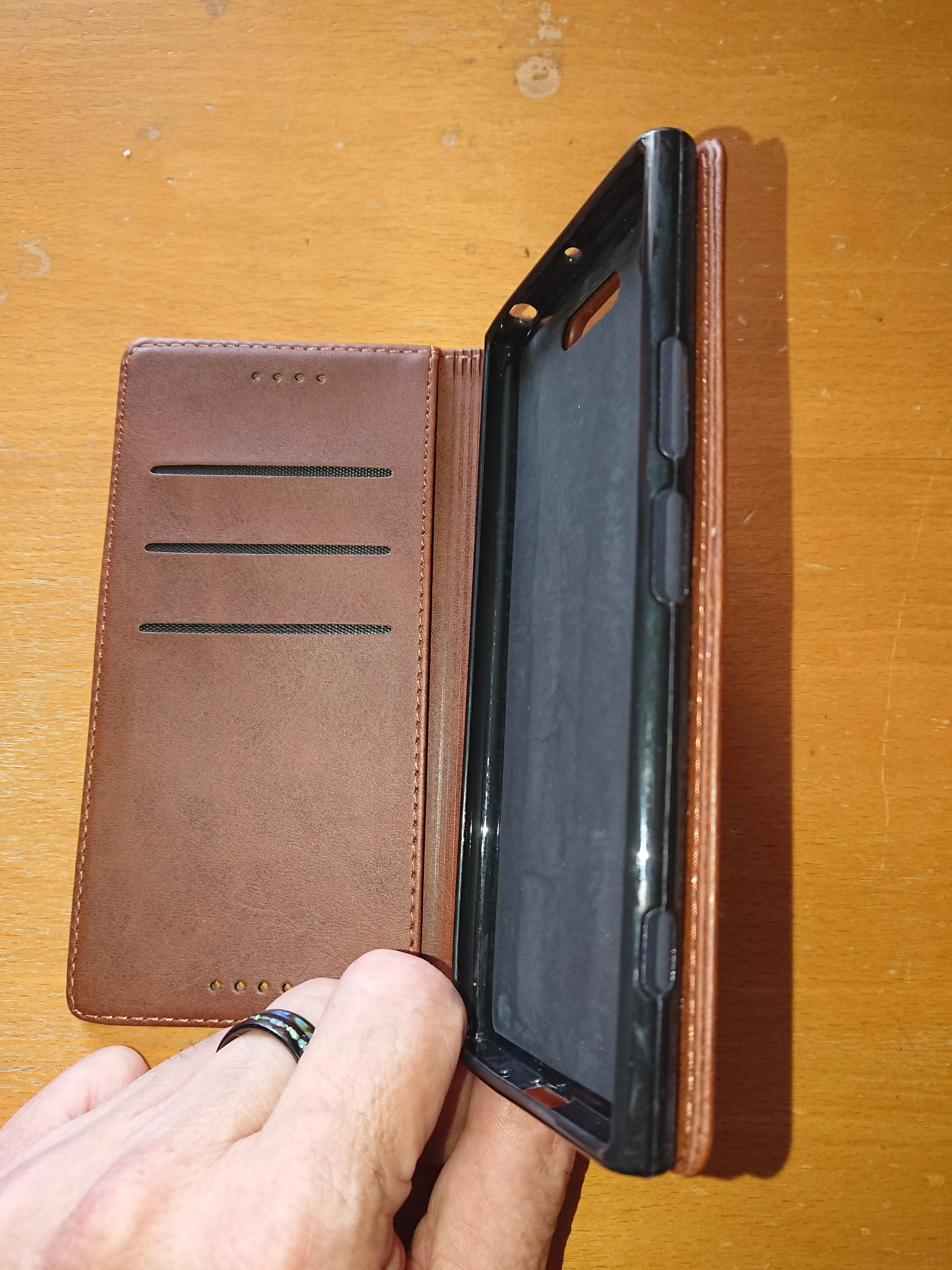 Чехол не понравился. Выглядит он очень красиво, качественно сшит, но не удобный! Слишком глубоко посажен резиновый вкладыш, до кнопок пальцем трудно достать. Вообще, чехол громоздкий, тяжёлый, куча слоев на крышке, считаю это лишнее, ну да ладно. Переклеила в итоге вкладыш от моего старого чехла, разместила ближе к краю обложки, стало удобнее, правда камера с отверстием теперь немного не совпадает. Также удивило, что в чехле вшиты два здоровенных магнита, но не удосужились вшить магнит спереди, чтоб телефон просыпался при открытии. Положила магнитик от старого чехла в кармашек (внизу, слева от микрофона), теперь работает))