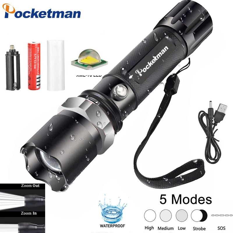 Светодиодсветильник вспышка, ультра яркая, XML T6, тактическая вспышка, 5 режимов, фонарик, 5000 лм, масштабируемый, водонепроницаемый, перезаряжаемый, 18650, z10
